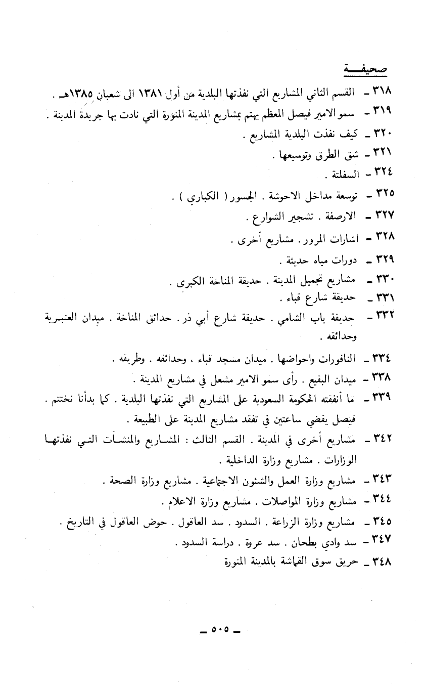 319 - سمو الأمير فيصل المعظم يهتم بمشاريع المدينة المنورة التي نادت بها جريدة المدينة. 320 - كيف نفذت البلدية المشاريع. 321 - شق الطرق وتوسيعها. 324 - السفلتة. 325 - توسعة مداخل الأحوشة. الجسور (الكباري). 327 - الأرصفة. تشجير الشوارع. 328 - اشارات المرور. مشاريع أخرى. 329 - دورات مياه حديثة. 330 - مشاريع تجميل المدينة. حديقة المناخة الكبرى. 331 - حديقة شارع قباء. 332 - حديقة باب الشامي. حديقة شارع أبي ذر. حدائق المناخة. ميدان العنبرية وحدائقه. 334 - النافورات واحواضها. ميدان مسجد قباء. وحدائقه. وطريقه. 338 - ميدان البقيع. رأى سمو الأمير مشعل في مشاريع المدينة. 339 - ما انفقته الحكومة السعودية على المشاريع التي نفذتها البلدية. كما بدأنا نختتم. فيصل يقضي ساعتين في تفقد مشاريع المدينة على الطبيعة. 342 - مشاريع أخرى في المدينة. القسم الثالث: المشاريع والمنشآت التي نفذتها الوزارات. مشاريع وزارة الداخلية. 343 - مشاريع وزارة العمل والشئون الاجتماعية. مشاريع وزارة الصحة. 344 - مشاريع وزارة المواصلات. مشاريع وزارة الاعلام. 345 - مشاريع وزارة الزراعة. السدود. سد العاقول. حوض العاقول في التاريخ. 347 - سد وادي بطحان. يد عروة. دراسة السدود.