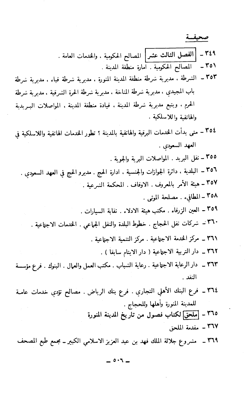 351 - المصالح الحكومية. امارة منطقة المدينة. 353 - الشرطة، مديرية شرطة منطقة المدينة المنورة، مديرية شرطة قباء، مديرية شرطة باب المجيدي، مديرية شرطة المناخة، مديرية شرطة الحرة الشرقية، مديرية شرطة الحرم، ويتبع مديرية شرطة المدينة، قيادة منطقة المدينة، المواصلات البريدية والهاتفية واللاسلكية. 354 - متى بدأت الخدمات البرقية والهاتفية بالمدينة؟ تطور الخدمات الهاتفية واللاسلكية في العهد السعودي. 355 - نقل البريد. المواصلات البرية والجوية. 356 - البلدية. دائرة الجوازات والجنسية، ادارة الحج. مديرو الحج في العهد السعودي. 357 - هيئة الأمر بالمعروف. الأوقاف. المحكمة الشرعية. 358 - المطافيء مصلحة الموتى. 359 - العين الزرقاء. مكتب هيئة الادلاء. نقابة السيارات. 360 - شركات نقل الحجاج. خطوط البلدة والنقل الجماعي. الخدمات الاجتماعية. 361 - مركز الخدمة الاجتماعية. مركز التنمية الاجتماعية. 362 - دار التربية الاجتماعية (دار الايتام سابقاً). 363 - دار الرعاية الاجتماعية. رعاية الشباب. مكتب العمل والعمال. البنوك. فرع مؤسسة النقد. 364 - فرع البنك الأهلي التجاري. 0فرع بنك الرياض. مصالح تؤدي خدمات عامة للمدينة المنورة وأهلها وللحجاج. 365 - ملحق لكتاب فصول من تاريخ المدينة المنورة. 367 - مقدمة الملحق