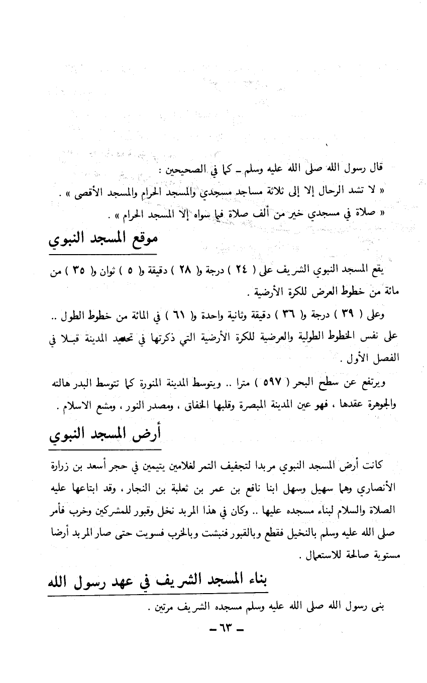 يقع المسجد النبوي الشريف على (24) درجة و (28) دقيقة و (5) ثوان و (35) من مائة من خطوط العرض للكرة الأرضية. وعلى (39) درجة و (36) دقيقة وثانية واحدة و (61) في المائة من خطوط الطول ... على نفس الخطوط الطولية والعرضية للكرة الأرضية التي ذكرتها في تحديد المدينة قبلا في الفصل الأول. ويرتفع عن سطح البحر (597) متراً ... ويتوسط المدينة المنورة كما تتوسط البدر هالته والجوهرة عقدها، فهو عين المدينة المبصرة وقلبها الخفاق، ومصدر النور، ومشع الإسلام.