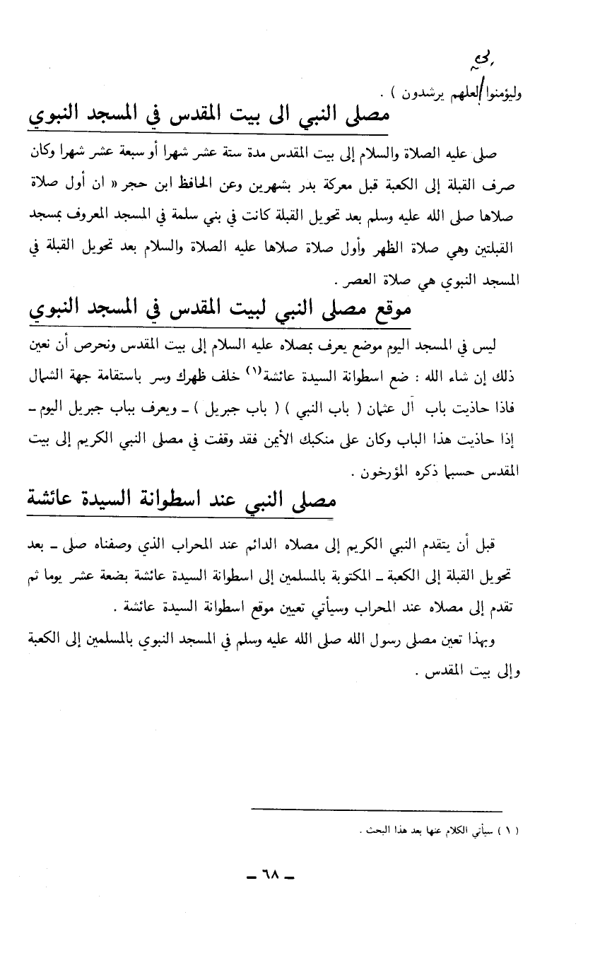 ليس في المسجد اليوم موضع يعرف بمصلاه عليه السلام إلى بيت المقدس ونحرص أن نعين ذلك إن شاء الله: ضع اسطوانة السيدة عائشة (1) خلف ظهرك وسر باستقامة جهة الشمال فإذا حاذيت باب آل عثمان (باب النبي) (باب جبريل) - ويعرف بباب جبريل اليوم - إذا حاذيب هذا الباب وكان على منكبك الايمن فقد وقفت في مصلى النبي الكريم إلى بيت المقدس حسبما ذكره المؤرخون.