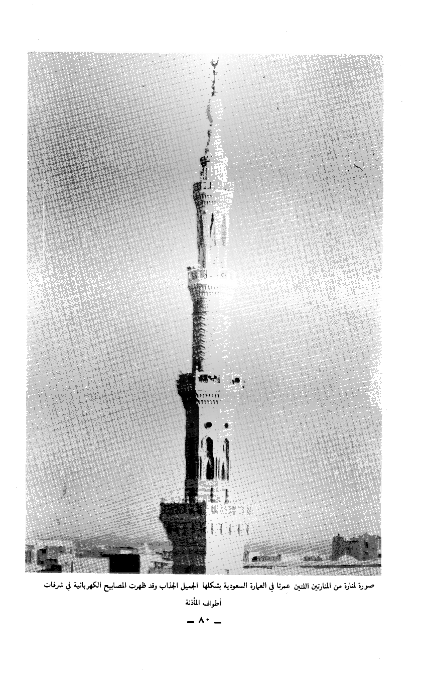 صورة لمنارة من المنارتين اللتين عمرتا في العمارة السعودية بشكلها الجميل الجذاب وقد ظهرت المصابيح الكهربائية في شرفات أطواف المأذنة…