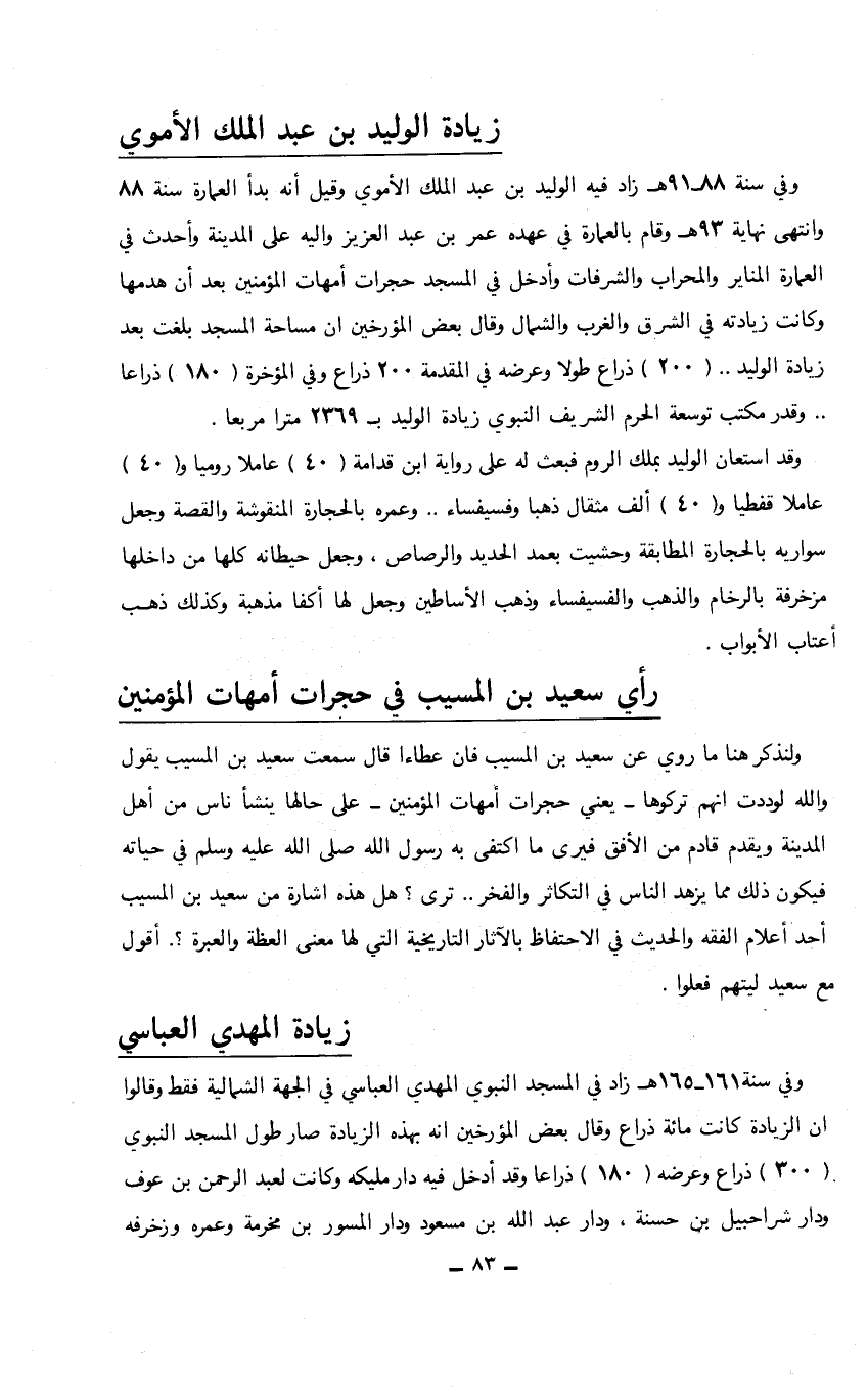 ولنذكر هنا ما روي عن سعيد بن المسيب فإن عطاءا قال سمعت سعيد بن المسيب يقول والله لوددت أنهم تركوها- يعني حجرات أمهات المؤمنين- على حالها ينشأ ناس من أهل المدينة ويقدم قادم من الأفق فيرى ما اكتفى به رسول الله صلى الله عليه وسلم في حياته فيكون ذلك مما يزهد الناس في التكاثر والفخر .. ترى؟ هل هذه اشارة من سعيد بن المسيب أحد أعلام الفقه والحديث في الاحتفاظ بالآثار التاريخية التي لها معنى العظة والعبرة؟. أقول مع سعيد ليتهم فعلوا.