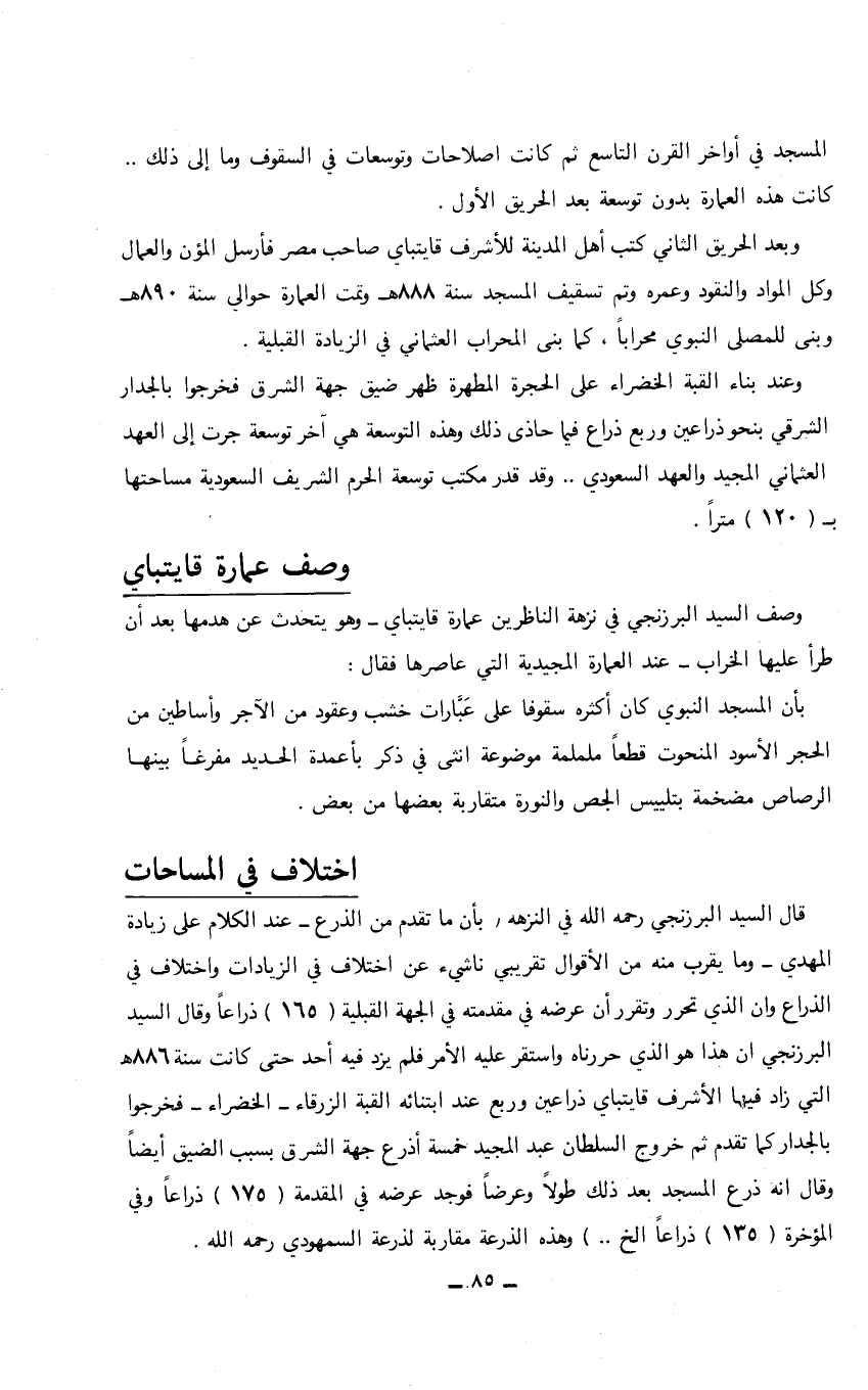 قال السيد البرزنجي رحمه الله في النزهة بأن ما تقدم من الذرع- عند الكلام على زيادة المهدي- وما يقرب منه من الأقوال تقريبي ناشيء عن اختلاف في الزيادات واختلاف في الذراع وأن الذي تحرر وتقرر أن عرضه في مقدمته في الجهة القبلية (165) ذراعاً وقال السيد البرزنجي أن هذا هو الذي حررناه واستقر عليه الأمر فلم يرد فيه أحد حتى كانت سنة 886هـ التي زاد فيها الأشرف قايتباي ذراعين وربع عند ابتنائه القبة الزرقاء- الخضراء- فخرجوا بالجدار كما تقدم ثم خروج السلطان عبد المجيد خمسة أذرع جهة الشرق بسبب الضيق أيضاً وقال أنه ذرع المسجد بعد ذلك طولاً وعرضاص فوجد عرضه في المقدمة (175) ذراعاً وفي المؤخرة (135) ذراعاً إلخ ... ) وهذه الذرعة مقاربة لذرعة السمهودي رحمه الله.…