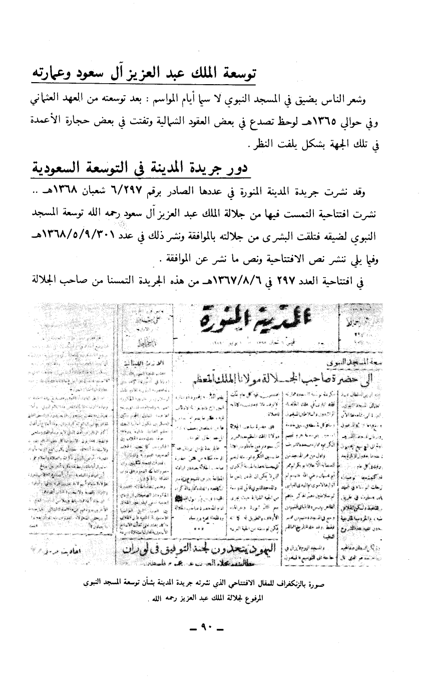صورة بالزنكغراف للمقال الافتتاحي الذي نشرته جريدة المدينة بشأن توسعة المسجد النبوي المرفوع لجلالة الملك عبد العزيز رحمه الله…
