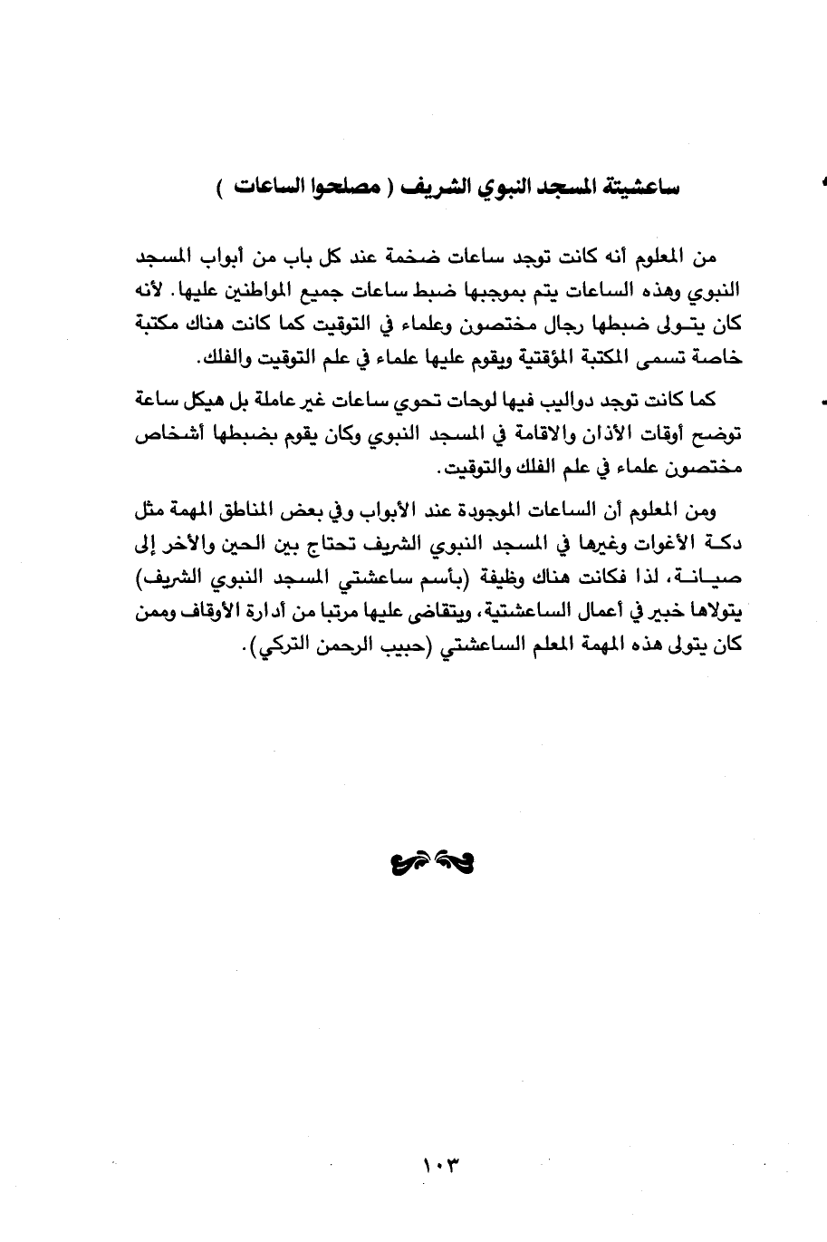 من المعلوم انه كانت توجد ساعات ضخمة عند كل باب من ابواب المسجد النبوي وهذه الساعات يتم بموجبها ضبط ساعات جميع المواطنين عليها. لأنه كان يتولى ضبطها رجال مختصون وعلماء في التوقيت كما كانت هناك مكتبة خاصة تسمى المكتبة المؤقتية ويقوم عليها علماء في علم التوقيت والفلك. كما كانت توجد دواليب فيها لوحات تحوي ساعات غير عاملة بل هيكل ساعة توضح أوقات الأذان والاقامة في المسجد النبوي وكان يقوم بضبطها اشخاص مختصون علماء في علم الفلك والتوقيت. ومن المعلوم أن الساعات الموجودة عند الأبواب وفي بعض المناطق المهمة مثل دكة الاغوات وغيرها في المسجد النبوي الشريف تحتاج بين الحين والأخر إلى صيانة، لذا فكانت هناك وظيفة (بأسم ساعشتي المسجد النبوي الشريف) يتولاها خبير في أعمال الساعشتية، ويتقاضى عليها مرتبا من أدارة الأوقاف وممن كان يتولى هذه المهمة المعلم الساعشتي (حبيب الرحمن التركي).…