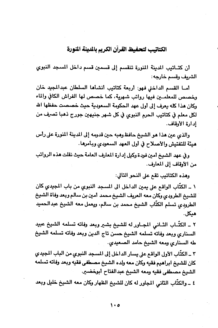 1 - الكتّاب الواقع على يمين الداخل الى المسجد النبوي من باب المجيدي كان للشيخ الطرودي وكان معه العريف الشيخ محمد امين بن سالم وبعد وفاة الشيخ الطرودي تسلم الكتّاب الشيخ محمد بن سالم، ويعمل معه الشيخ عبد الحميد هيكل. 2 - الكتّاب الثاني المجاور له للشيخ بشير وبعد وفاته تسلمه الشيخ عبيد السناري وبعد وفاته تسلمه الشيخ حسن تاج الدين وبعد وفاته تسلمه الشيخ طه السناري ومعه الشيخ حامد الصعيدي. 3 - الكتّاب الأول على يسار الداخل الى المسجد النبوي من الباب المجيدي كان للشيخ ابراهيم فقيه وكان معه ولده الشيخ مصطفى فقيه وبعد وفاته تسلمه الشيخ مصطفى فقيه ومعه الشيخ عبد الفتاح أبو خضير. 4 - والكتّاب الثاني المجاور له كان للشيخ الظهار وكان معه الشيخ خليل وبعد…