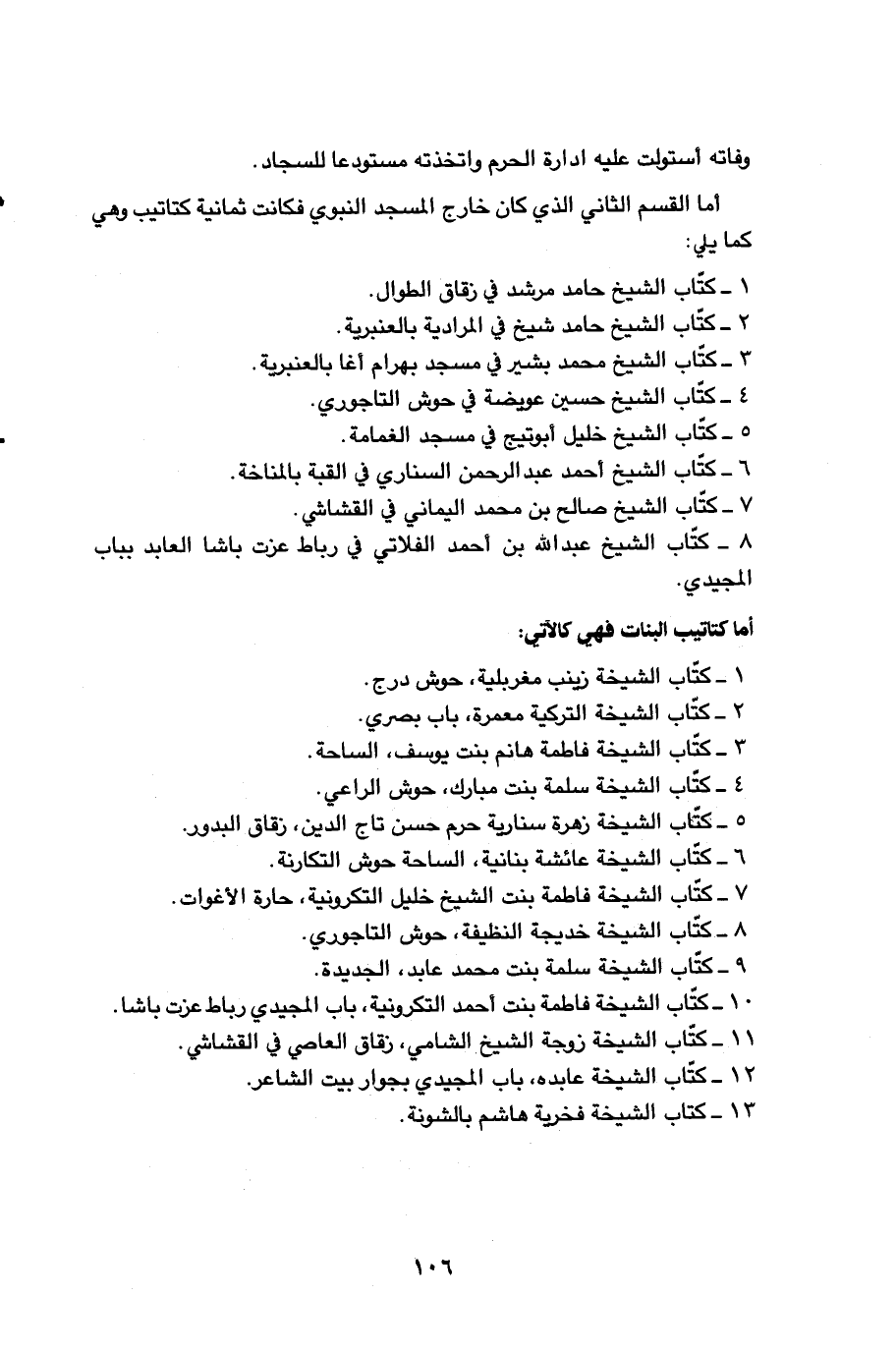 اما كتاتيب البنات فهي كالآتي: 1 - كتاب الشيخة زينب مغربلية، حوش درج. 2 - كتاب الشخية التركية معمرة، باب بصري. 3 - كتاب الشيخة فاطمة هانم بنت يوسف، الساحة. 4 - كتاب الشيخة سلمة بنت مبارك، حوش الراعي. 5 - كتاب الشيخة زهرة سنارية حرم حسن تاج الدين، زقاق البدور. 6 - كتاب الشيخة عائشة بنانية، الساحة حوش التكارنة. 7 - كتاب الشيخة فاطمة بنت الشيخ خليل الكترونية، حارة الأغوات. 8 - كتاب الشيخة خديجة النظيفة، حوش التاجوري. 9 - كتاب الشيخة سلمة بنت محمد عابد، الجديدة. 10 - كتاب الشيخة فاطمة بنت احمد التكرونية، باب المجيدي رباط عزت باشا. 11 - كتاب الشيخة زوجة الشيخ الشامي، زقاق العاصي في القشاشي. 12 - كتاب الشيخة عابده، باب المجيدي بجوار بيت الشاعر. 13 - كتاب الشيخة فخرية هاشم بالشونة.…