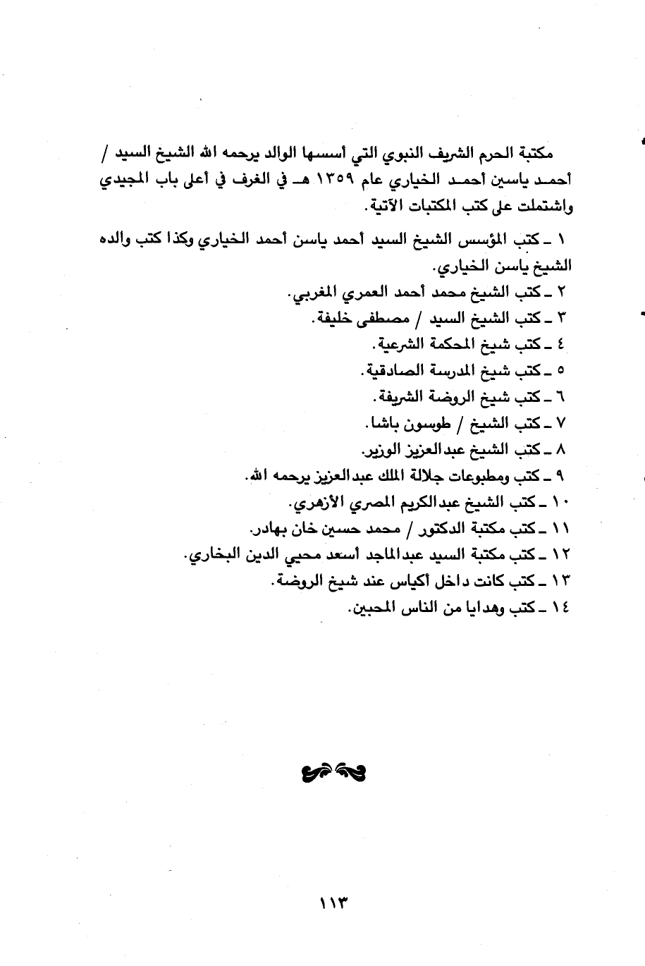 3 - كتب الشيخ السيد / مصطفى خليفة. 4 - كتب شيخ المحكمة الشرعية. 5 - كتب شيخ المدرسة الصادقية. 6 - كتب شيخ الروضة الشريفة. 7 - كتب الشيخ / طوسون باشا. 8 - كتب الشيخ عبد العزيز الوزير. 9 - كتب ومطبوعات جلالة الملك عبد العزيز يرحمه الله. 10 - كتب الشيخ عبد الكريم المصري الأزهري. 11 - كتب مكتبة الدكتور / محمد حسين خان بهادر. 12 - كتب مكتبة السيد عبد الماجد أسعد محيي الدين البخاري. 13 - كتب كانت داخل أكياس عند شيخ الروضة.