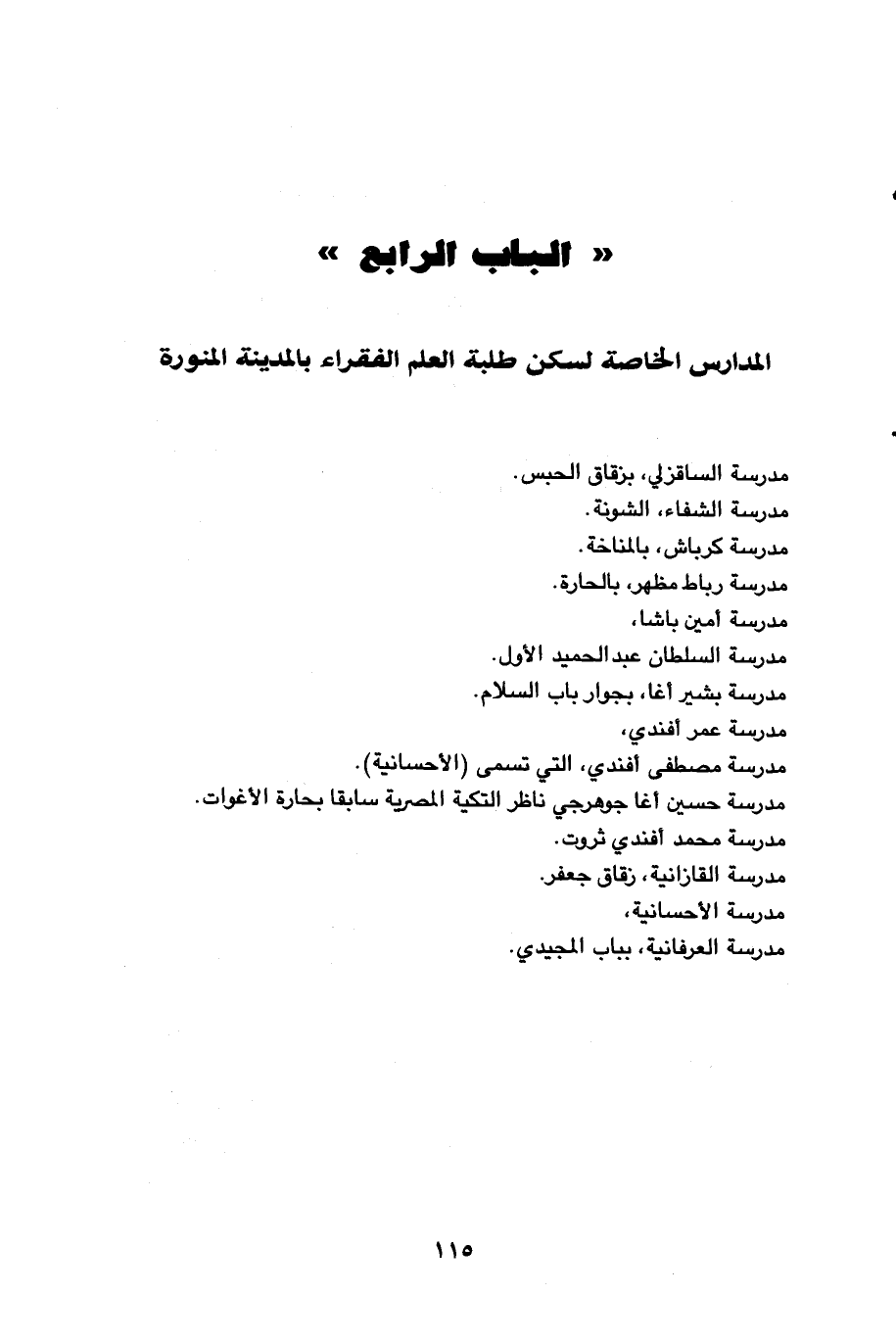 مدرسة الشفاء، الشونة. مدرسة كرباش، بالمناخة. مدرسة رباط مظهر، بالحارة. مدرسة أمين باشا. مدرسة السلطان عبد الحميد الأول. مدرسة بشير أغا، بجوار باب السلام. مدرسة عمر افندي. مدرسة مصطفى أفندي، التي تسمى (الأحسانية). مدرسة حسين أغا جوهرجي ناظر التكية المصرية سابقا بحارة الأغوات. مدرسة محمد افندي ثروت. مدرسة القازانية، زقاق جعفر. مدرسة الأحسانية.