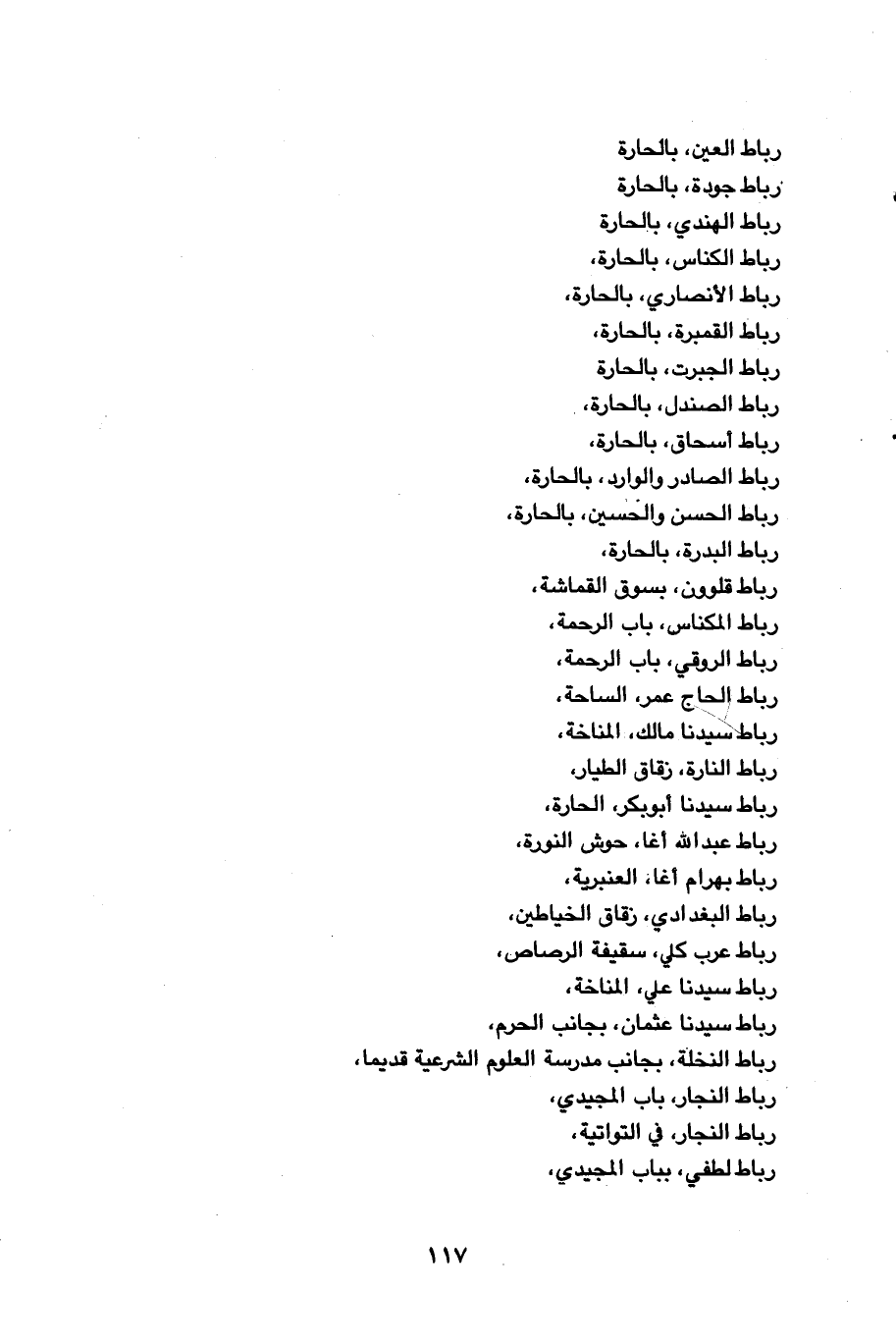 117…رباط العين، بالحارة رباط جودة، بالحارة رباط الهندي، بالحارة رباط الكناس، بالحارة رباط الأنصاري، بالحارة رباط القمبرة، بالحارة رباط الجبرت، بالحارة رباط الصندل، بالحارة رباط أسحاق، بالحارة رباط الصادر والوارد، بالحارة رباط الحسن والحسين، بالحارة، رباط البدرة، بالحارة، رباط قلوون، بسوق القماشة، رباط المكناس، باب الرحمة، رباط الروقي، باب الرحمة، رباط الحاج عمر، الساحة، رباط سيدنا مالك، المناخة، رباط النارة، زقاق الطيار، رباط سيدنا ابو بكر، الحارة، رباط عبد الله أغا، حوش النورة، رباط بهرام أغا، العنبرية، رباط البغدادي، زقاق الخياطين، رباط عرب كلي، سقيفة الرصاص، رباط سيدنا علي، المناخة، رباط سيدنا عثمان، بجانب الحرم، رباط النخلة، بجانب مدرسة العلوم الشرعية قديما، رباط النجار، باب المجيدي، رباط النجار، في التواتية، رباط لطفي، بباب المجيدي،…