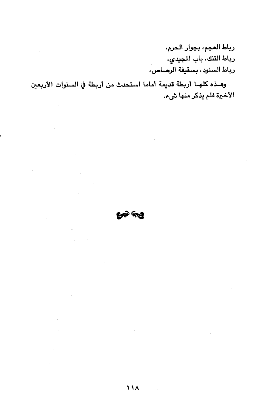 118…رباط العجم، بجوار الحرم، رباط التنك، باب المجيدي، رباط السنود، بسقيفة الرصاص، وهذه كلها أربطة قديمة أماما استحدث من أربطة في السنوات الأربعين الأخيرة فلم يذكر منها شىء.…
