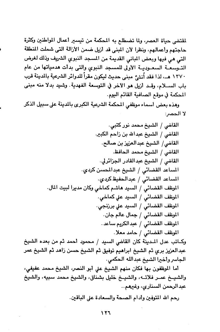 126…لمقتضي حياة العصر، ولما تضطلع به المحكمة من تيسير أعمال المواطنين وكثرة حاجتهم وأعمالهم، ونظرا لأن المبنى قد أزيل ضمن الأزالة التي شملت المنطقة التي هي فيها وبعض المباني القديمة من المسجد النبوي الشريف وذلك لغرض التوسعة السعودية الأولى للمسجد النبوي والتي بدأت هدمياتها من عام 1370هـ، لذا فقد أنشىء حديث ليكون مقراً للدوائر الشرعية بالمدينة قرب باب السلام، وقد أزيل هو الآخر في التوسعة الفهدية. وشيد بدلا منه مبنى المحكمة في موقع الصافية القائم اليوم. وهذه بعض أسماء موظفي المحكمة الشرعية الكبرى بالمدينة على سبيل الذكر لا الحصر: