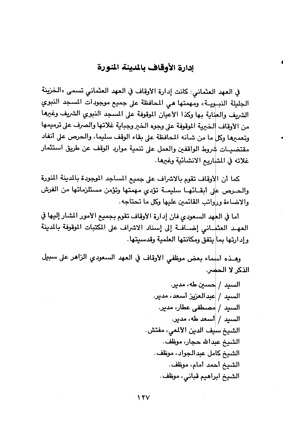 وهذه أسماء بعض موظفي الأوقاف في العهد السعودي الزاهر على سبيل الذكر لا الحصر. السيد / حسين طه، مدير. السيد / عبد العزيز أسعد، مدير. السيد / مصطفى عطار، مدير. السيد / أسعد طه، مدير الشيخ سيف الدين الألمعي، مفتش. الشيخ عبد الله حجار، موظف. الشيخ كامل عبد الجواد، موظف. الشيخ أحمد أمام، موظف. الشيخ ابراهيم قباني، موظف.…