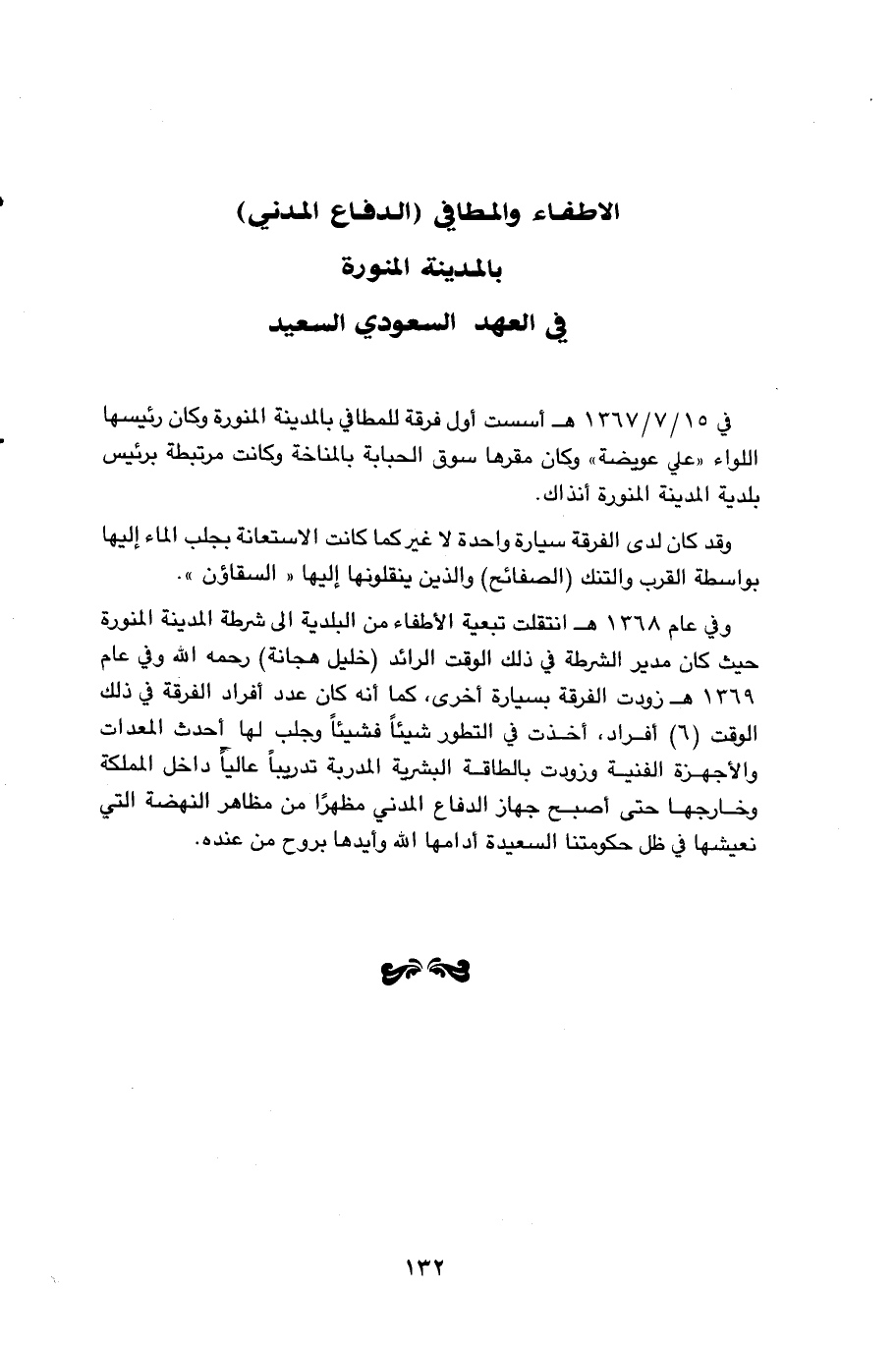 في 1367/ 7/15هـ أسست أول فرقة للمطافي بالمدينة المنورة وكان رئيسها اللواء
