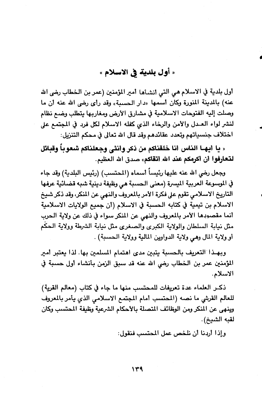 اول بلدية في الاسلام هي التي أنشأها أمير المؤمنين (عمر بن الخطاب رضي الله عنه) بالمدينة المنورة وكان اسمها ((دار الحسبة)) وقد رأى رضي الله عنه ان ما وصلت اليه الفتوحات الاسلامية في مشارق الارض ومغاربها يتطلب وضع نظام لنشر لواء العدل والأمن والرخاء الذي كفله الاسلام لكل فرد في المجتمع على اختلاف جنسياتهم وتعدد عقائدهم وقد قال الله تعالى في محكم التنزيل: ((يا ايها الناس انا خلقناكم من ذكر وانثى وجعلناكم شعوبا وقبائل لتعارفوا ان اكرمكم عند الله أتقاكم)) صدق الله العظيم. وجعل رضي الله عنه رئيسا أسماه (المحتسب) (رئيس البلدية) وقد جاء في الموسوعة العربية الميسرة (معنى الحسبة هي وظيفة دينية شبه قضائية عرفها التاريخ الاسلامي تقوم على فكرة الأمر بالمعروف والنهي عن المنكر، وقد ذكر شيخ الاسلام بن تيمية في كتابه الحسبة في الاسلام (أن جميع الولايات الاسلامية أنما مقصودها الأمر بالمعروف والنهي عن المنكر سواء في ذلك عن ولاية الحرب مثل نيابة السلطان والولاية الكبرى والصغرى مثل نيابة الشرطة وولاية الحكم أو ولاية المال وهي ولاية الدواوين المالية وولاية الحسبة). وبهذا التعريف بالحسبة يتبين مدى اهتمام المسلمين بها. لذا يعتبر أمير المؤمنين عمر بن الخطاب رضي الله عنه قد سبق الزمن بأنشاء أول حسبة في الاسلام. ذكر العلماء عدة تعريفات للمحتسب منها ما جاء في كتاب (معالم القرية) للعالم القرشي ما نصبه (المحتسب أمام المجتمع الاسلامي الذي يأمر بالمعروف وينهى عن المنكر ومن الوظائف المتصلة بالأحكام الشرعية وظيفة المحتسب وكان لقبه الشيخ). وإذا أردنا أن نلخص عمل المحتسب فنقول:…