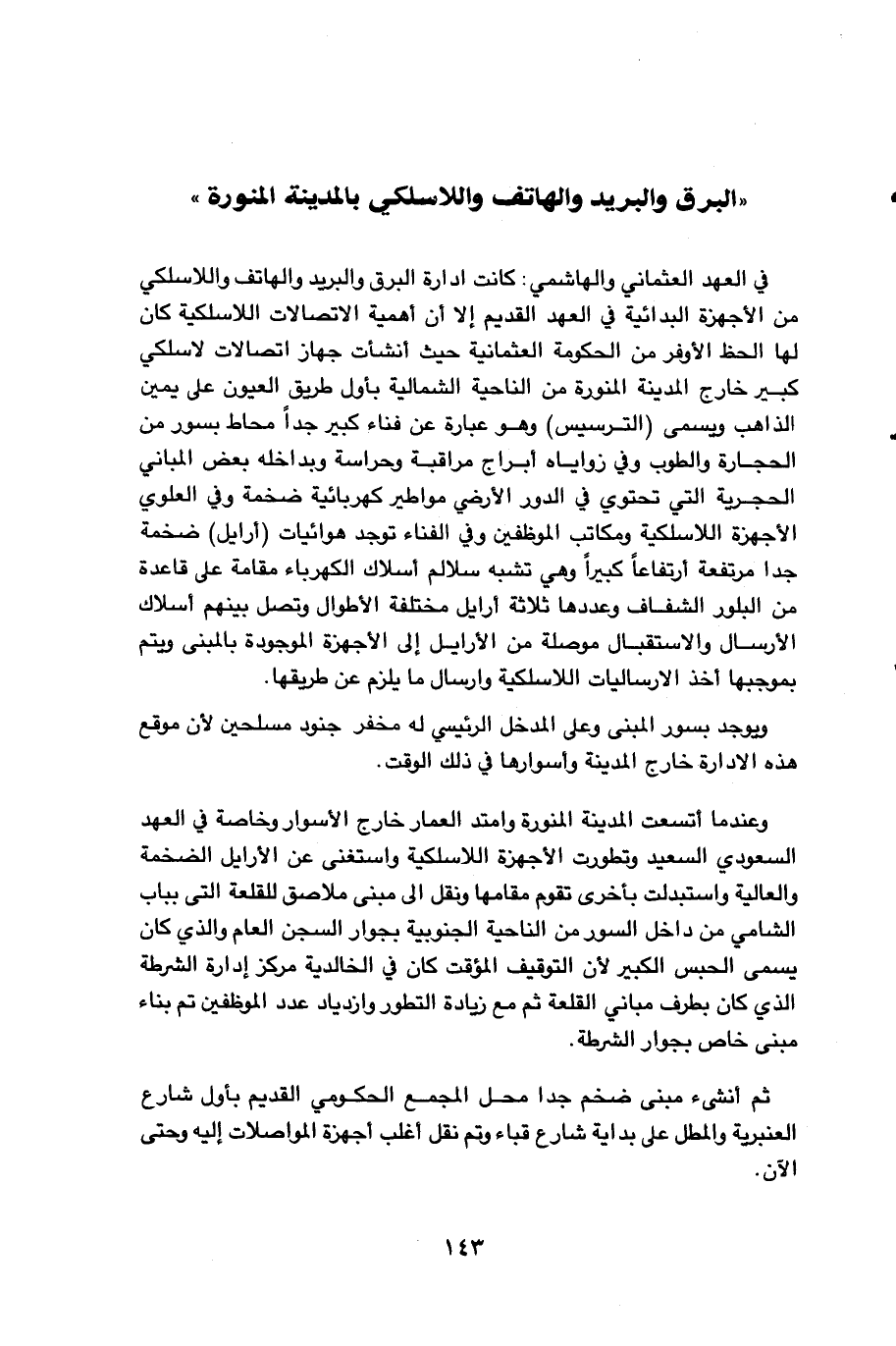 في العهد العثماني والهاشمي: كانت ادارة البرق والبريد والهاتف واللاسلكي من الأجهزة البدائية في العهد القديم إلا ان اهمية الاتصالات اللاسلكية كان لها الحظ الأوفر من الحكومة العثمانية حيث أنشأت جهاز اتصالات لاسلكي كبير خارج المدينة المنورة من الناحية الشمالية بأول طريق العيون على يمين الذاهب ويسمى (الترسيس) وهو عبارة عن فناء كبير جداً محاط بسور من الحجارة والطوب وفي زواياه أبراج مراقبة وحراسة وبداخله بعض المباني الحجرية التي تحتوي في الدور الأرضي مواطير كهربائية ضخمة وفي العلوي الأجهزة اللاسلكية ومكاتب الموظفين وفي الفناء توجد هوائيات (أرايل) ضخمة جدا مرتفعة ارتفاعا كبيرا وهي تشبه سلالم اسلاك الكهرباء مقامة على قاعدة من البلور الشفاف وعددها ثلاثة أرايل مختلفة الاطوال وتصل بينهم اسلاك الارسال والاستقبال موصولة من الارايل الى الاجهزة الموجودة بالمبنى ويتم بموجبها اخذ الارساليات اللاسلكية وارسال ما يلزم عن طريقها. ويوجد بسور المبنى وعلى المدخل الرئيسي له مخفر جنود مسلحين لأن موقع هذه الادارة خارج المدينة وأسوارها في ذلك الوقت. وعندما اتسعت المدينة المنورة وامتد العمار خارج الاسوار وخاصة في العهد السعودي السعيد وتطورت الاجهزة اللاسلكية واستغنى عن الارايل الضخمة والعالية واستبدلت بأخرى تقوم مقامها ونقل الى مبنى ملاصق للقلعة التي بباب الشامي من داخل السور من الناحية الجنوبية بجوار السجن العام والذي كان يسمى الحبس الكبير لأن التوقيف المؤقت كان في الخالدية مركز ادارة الشرطة الذي كان بطرف مباني القلعة ثم مع زيادة التطور وازدياد عدد الموظفين تم بناء مبنى خاص بجوار الشرطة. ثم أنشىء مبنى ضخم جدا محل المجمع الحكومي القديم بأول شارع العنبرية والمطل على بداية شارع قباء وتم نقل أغلب أجهزة المواصلات اليه وحتى الآن.…