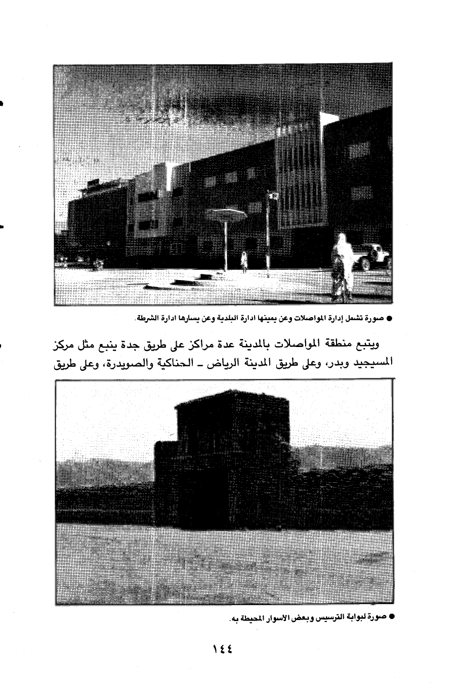 144…صورة تشمل ادارة الموصلات وعن يمينها ادارة البلدية وعن يسارها ادارة الشرطة. ويتبع منطقة المواصلات بالمدينةعدة مراكز على طريق جدة ينبع مثل مركز المسيجيد وبدر، وعلى طريق المدينة الرياض ـ الحناكية والصويدرة، وعلى طريق صورة لبوابة الترسيس وبعض الاسوار المحيطة به.…