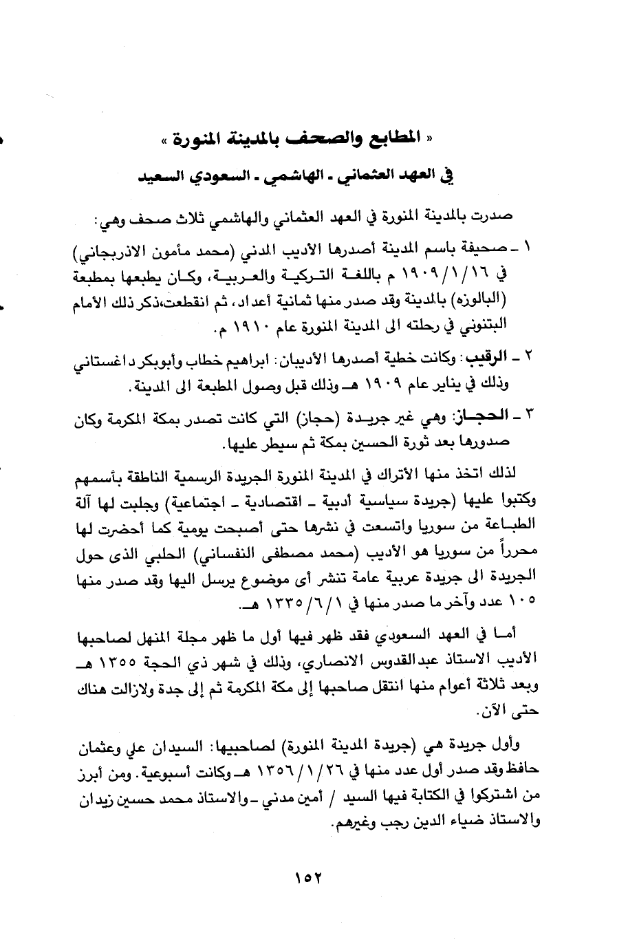 صدرت بالمدينة المنورة في العهد العثماني والهاشمي ثلاث صحف وهي: 1 - صحيفة باسم المدينة أصدرها الأديب المدني (محمد مأمون الأذربجاني) في 1909/ 1/16م باللغة التركية والعربية، وكان يطبعها بمطبعة (البالوزة) بالمدينة وقد صدر منها ثمانية أعداد، ثم انقطعت، ذكر ذلك الامام البتنوني في رحلته الى المدينة المنورة عام 1910م. 2 - الرقيب: وكانت خطية أصدرها الاديبان: ابراهيم خطاب وأبو بكر داغستاني وذلك في يناير عام 1909 هـ وذلك قبل وصول المطبعة الى المدينة 3 - الحجاز: وهي غير جريدة (حجاز) التي كانت تصدر بمكة المكرمة وكان صدورها بعد ثورة الحسين بمكة ثم سيطر عليها. لذلك اتخذ منها الأتراك في المدينة المنورة الجريدة الرسمية الناطقة بأسمهم وكتبوا عليها (جريدة سياسية أدبية ـ اقتصادية ـ اجتماعية) وجلبت لها آلة الطباعة من سوريا واتسعت في نشرها حتى أصبحت يومية كما أحضرت لها محررا من سوريا هو الاديب (محمد مصطفى النفساني) الحلبي الذي حول الجريدة الى جريدة عربية عامة تنشر اى موضوع يرسل اليها وقد صدر منها 105 عدد وآخر ما صدر منها في 1335/ 6/1هـ. أما في العهد السعودي فقد ظهر فيها اول ما ظهر مجلة المنهل لصاحبها الأديب الأستاذ عبد القدوس الانصاري، وذلك في شهر ذي الحجة 1355هـ وبعد ثلاثة أعوام منها انتقل صاحبها الى مكة المكرمة ثم الى جدة ولازالت هناك حتى الآن. واول جريدة هي (جريدة المدينة المنورة) لصاحبيها: السيدان علي وعثمان حافظ وقد صدر أول عدد منها في 1356/ 1/26 هـ وكانت اسبوعية. ومن ابرز من اشتركوا في الكتابة فيها السيد / أمين مدني ـ والأستاذ محمد حسين زيدان والأستاذ ضياء الدين رجب وغيرهم.…