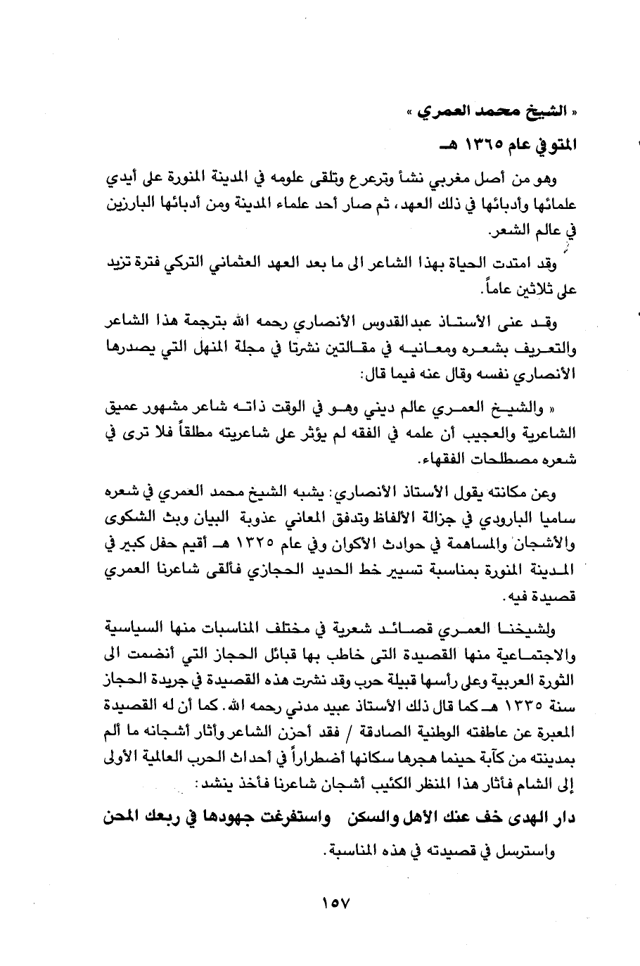 ((والشيخ العمري عالم ديني وهو في الوقت ذاته شاعر مشهور عميق الشاعرية والعجيب ان علمه في الفقه لم يؤثر على شاعريته مطلقا فلا ترى في شعره مصطلحات الفقهاء. وعن مكانته يقول الأستاذ الأنصاري: يشبه الشيخ محمد العمري في شعره ساميا البارودي في جزالة الألفاظ وتدفق المعاني عذوبة البيان وبث الشكوى والأشجان والمساهمة في حوادث الاكوان وفي عام 1325 هـ اقيم حفل كبير في المدينة المنورة بمناسبة تسيير خط الحديد الحجازي فألقى شاعرنا العمري قصيدة فيه. ولشيخنا العمري قصائد شعرية في مختلف المناسبات منها السياسية والأجتماعية منها القصيدة التي خاطب بها قبائل الحجاز التي أنضمت الى الثورة العربية وعلى رأسها قبيلة حرب وقد نشرت هذه القصيدة في جريدة الحجاز سنة 1335 هـ كما قال ذلك الأستاذ عبيد مدني رحمه الله. كما ان له القصيدة المعبرة عن عاطفته الوطنية الصادقة / فقد أحزن الشاعر واثار اشجانه ما ألم بمدينته من كآبة حينما هجرها سكانها اضطرارا في احداث الحرب العالمية الأولى الى الشام فأثار هذا المنظر الكئيب اشجان شاعرنا فأخذ ينشد: