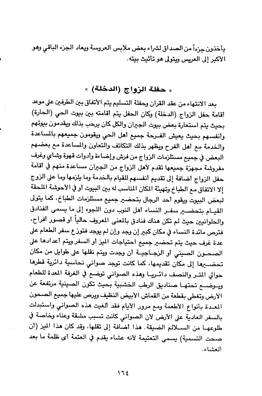 164…يأخذون جزءاً من الصداق لشراء بعض ملابس العروسة ويعاد الجزء الباقي وهو الأكبر إلى العريس ويتولى هو تأثيث بيته.