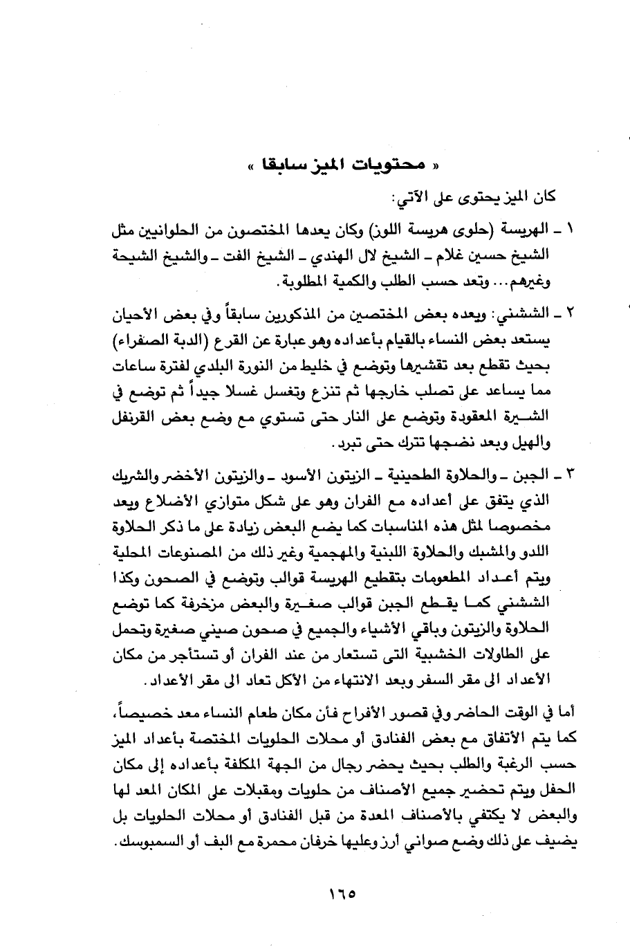 3 - الجبن ـ والحلاوة الطحينية ـ الزيتون الأسود ـ والزيتون الاخضر والشريك الذي يتفق على اعداده مع الفران وهو على شكل متوازي الأضلاع ويعد مخصوصا لمثل هذه المناسبات كما يضع البعض زيادة على ما ذكر الحلاوة اللدو والمشبك والحلاوة اللبنية والمهجمية وغير ذلك من المصنوعات المحلية ويتم اعداد المطعومات بتقطيع الهريسة قوالب وتوضع في الصحون وكذا الششني كما يقطع الجبن قوالب صغيرة والبعض مزخرفة كما توضع الحلاوة والزيتون وباقي الأشياء والجميع في صحون صيني صغيرة وتحمل على الطاولات الخشبية التي تستعار من عند الفران او تستأجر من مكان الأعداد الى مقر السفر وبعد الانتهاء من الأكل تعاد الى مقر الأعداد.