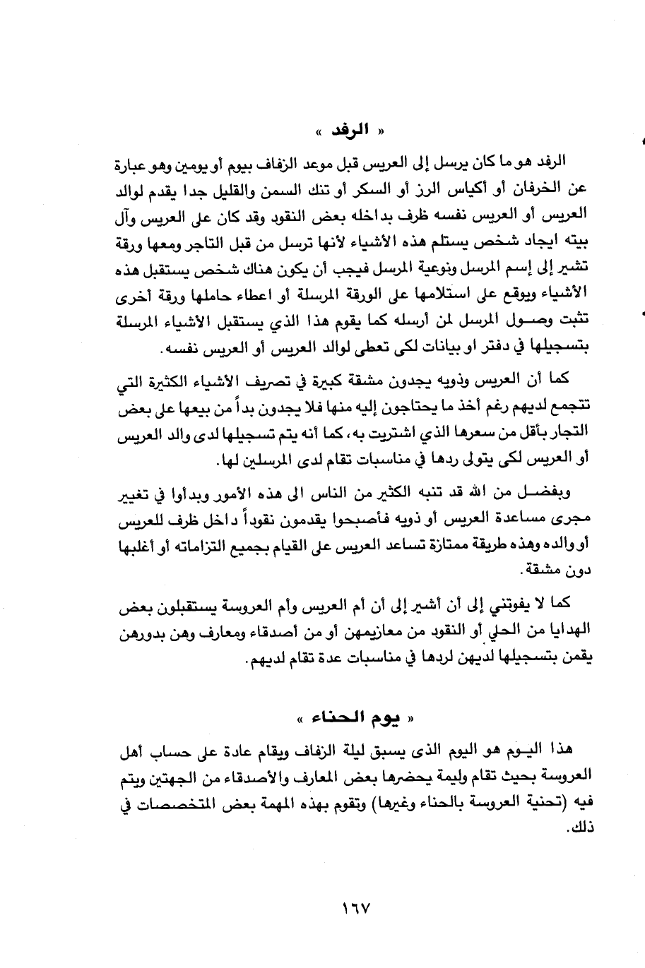 الرفد هو ماكان يرسل الى العريس قبل موعد الزفاف بيوم او يومين وهو عبارة عن الخرفان أو اكياس الرز أو السكر أو تنك السمن والقليل جدا يقدم لوالد العريس او العريس نفسة ظرف بداخله بعض النقود وقد كان على العريس وآل بيته ايجاد شخص يستلم هذه الاشياء لأنها ترسل من قبل التاجر ومعها ورقة تشير الى اسم المرسل ونوعية المرسل فيجب ان يكون هناك شخص يستقبل هذه الأشياء ويوقع على استلامها على الورقة المرسلة او اعطاء حاملها ورقة اخرى تثبت وصول المرسل لمن أرسله كما يقوم هذا الذي يستقبل الأشياء المرسلة بتسجيلها في دفتر او بيانات لكى تعطى لوالد العريس أو العريس نفسه. كما ان العريس وذويه يجدون مشقة كبيرة في تصريف الأشياء الكثيرة التي تتجمع لديهم رغم أخذ ما يحتاجون إليه منها فلا يجدون بداً من بيعها على بعض التجار بأقل من سعرها الذي اشتريت به، كما أنه يتم تسجيلها لدى والد العريس او العريس لكي يتولى ردها في مناسبات تقام لدى المرسلين لها. وبفضل من الله قد تنبه الكثير من الناس الى هذه الأمور وبدأوا في تغيير مجرى مساعدة العريس أو ذويه فأصبحوا يقدمون نقودا داخل ظرف للعريس أو والده وهذه طريقة ممتازة تساعد العريس على القيام بجميع التزاماته أو أغلبها دون مشقة. كما لايفوتني إلى أن أشير إلى أم العريس وأم العروسة يستقبلون بعض الهدايا من الحلي أو النقود من معازيمهن أو من أصدقاء ومعارف وهن بدورهن يقمن بتسجيلها لديهن لردها في مناسبات عدة تقام لديهم.