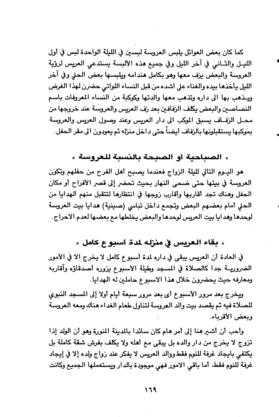 في العادة أن العريس يبقى في داره لمدة اسبوع كامل لا يخرج الا في الأمور الضرورية جدا كالصلاة في المسجد وطيلة الأسبوع يزوره أصدقاؤه وآقاربه ومعارفه حيث يحضرون خلال هذا الاسبوع حاملين له الهدايا. ويخرج بعد مرور الأسبوع أى بعد مرور سبعة أيام أولا الى المسجد النبوي للصلاة فيه ثم يقصد بيت والد العروسة لتناول طعام الغداء هناك ومعه العروسة وبعض الأقرباء. وأحب أن اشير هنا إلى أمر هام كان سائدا بالمدينة المنورة وهو أن الولد إذا تزوج لا يخرج من دار والده بل يبقى مع أهله ولا يكلف بفرش شقة كاملة بل يكتفي بايجاد غرفة للنوم فقط ووالد العريس لا يفكر عند زواج ولده إلا في إيجاد غرفة للنوم فقط، أما باقي الامور فهي موجودة بالدار ويستعملها الجميع وكانت…