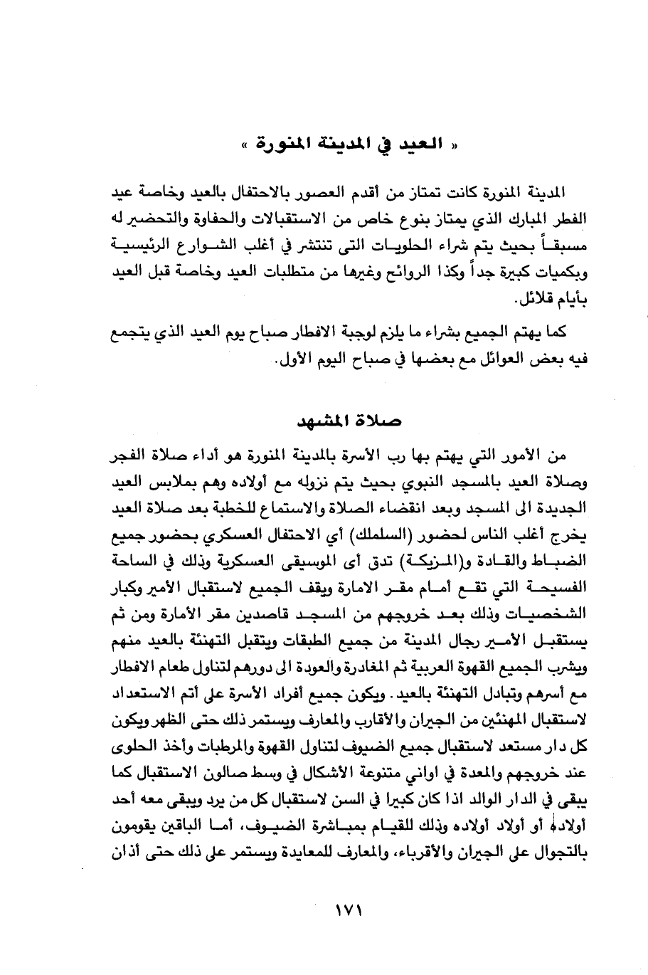 من الأمور التي يهتم بها رب الأسرة بالمدينة المنورة هو أداء صلاة الفجر وصلاة العيد بالمسجد النبوي بحيث يتم نزوله مع أولاده وهم بملابس العيد الجديدة الى المسجد وبعد انقضاء الصلاة والاستماع للخطبة بعد صلاة العيد يخرج أغلب الناس لحضور (السلملك) أي الاحتفال العسكري بحضور جميع الضباط والقادة و (المزيكة) تدق أى الموسيقى العسكرية وذلك في الساحة الفسيحة التي تقع أمام مقر الامارة ويقف الجميع لاستقبال الأمير وكبار الشخصيات وذلك بعد خروجهم من المسجد قاصدين مقر الأمارة ومن ثم يستقبل الأمير رجال المدينة من جميع الطبقات ويتقبل التهنئة بالعيد منهم ويشرب الجميع القهوة العربية ثم المغادرة والعودة الى دورهم لتناول طعام الافطار مع أسرهم وتبادل التهنئة بالعيد. ويكون جميع أفراد الأسرة على أتم الاستعداد لاستقبال المهنئين من الجيران والأقارب والمعارف ويستمر ذلك حتى الظهر ويكون كل دار مستعد لاستقبال جميع الضيوف لتناول القهوة والمرطبات وأخذ الحلوى عند خروجهم والمعدة في أواني متنوعة الأشكال في وسط صالون الاستقبال كما يبقى في الدار الوالد اذا كان كبيرا في السن لاستقبال كل من يرد ويبقى معه أحد أولاده او أولاد اولاده وذلك للقيام بمباشرة الضيوف، أما الباقين يقومون بالتجوال على الجيران والأقرباء، والمعارف للمعايدة ويستمر على ذلك حتى أذان…