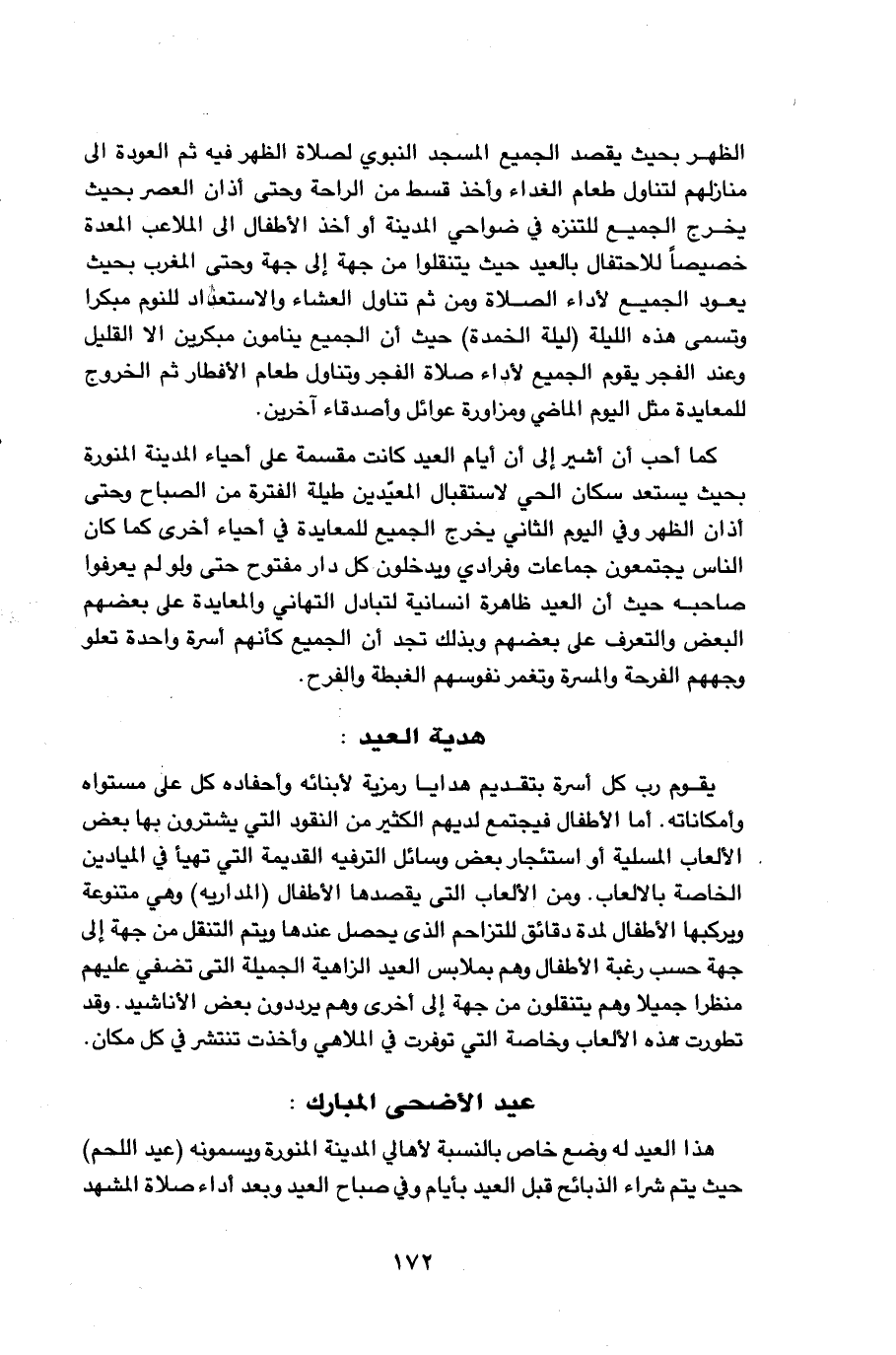 172…الظهر بحيث يقصد الجميع المسجد النبوي لصلاة الظهر فيه ثم العودة الى منازلهم لتناول طعام الغداء وأخذ قسط من الراحة وحتى أذان العصر بحيث يخرج الجميع للتنزه في ضواحي المدينة أو اخذ الأطفال الى الملاعب المعدة خصيصاً للاحتفال بالعيد حيث يتنقلوا من جهة إلى جهة وحتى المغرب بحيث يعود الجميع لأداء الصلاة ومن ثم تناول العشاء والاستعداد للنوم مبكرا وتسمى هذه الليلة (ليلة الخمدة) حيث أن الجميع ينامون مبكرين الا القليل وعند الفجر يقوم الجميع لأداء صلاة الفجر وتناول طعام الأفطار ثم الخروج للمعايدة مثل اليوم الماضي ومزاورة عوائل وأصدقاء آخرين. كما أحب أن اشير إلى أن ايام العيد كانت مقسمة على أحياء المدينة المنورة بحيث يستعد سكان الحي لاستقبال المعيدين طيلة الفترة من الصباح وحتى أذان الظهر وفي اليوم الثاني يخرج الجميع للمعايدة في أحياء أخرى كما كان الناس يجتمعون جماعات وفرادي ويدخلون كل دار مفتوح حتى ولو لم يعرفوا صاحبه حيث أن العيد ظاهرة انسانية لتبادل التهاني والمعايدة على بعضهم البعض والتعرف على بعضهم وبذلك تجد أن الجميع كأنهم أسرة واحدة تعلو وجههم الفرحة والمسرة وتغمر نفوسهم الغبطة والفرح.