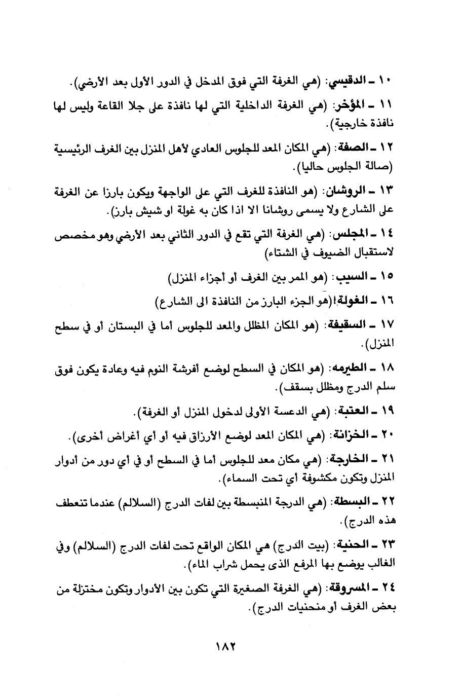 10 - الدقيسي: (هي الغرفة التي فوق المدخل في الدور الأول بعد الأرضي). 11 - المؤخر: (هي الغرفة الداخلية التى لها نافذة على جلا القاعة وليس لها نافذة خارجية). 12 - الصفة: (هي المكان المعد للجلوس العادي لأهل المنزل بين الغرف الرئيسية (صالة الجلوس حالياً). 13 - الروشان: (هو النافذة للغرف التي على الواجهة ويكون بارزا عن الغرفة على الشارع ولايسمى روشانا الا اذا كان به غولة او شيش بارز). 14 - المجلس: (هي الغرفة التي تقع في الدور الثاني بعد الأرضي وهو مخصص لاستقبال الضيوف في الشتاء) 15 - السيب: (هو الممر بين الغرف أو أجزاء المنزل) 16 - الغولة: (هو الجزء البارز من النافذة الى الشارع) 17 - السقيفة: (هو المكان المظلل والمعد للجلوس أما في البستان او في سطح المنزل). 18 - الطيرمه: (هو المكان في السطح لوضع أفرشة النوم فيه وعادة يكون فوق سلم الدرج ومظلل بسقف). 19 - العتبة: (هي الدعسة الأولى لدخول المنزل أو الغرفة). 20 - الخزانة: (هي المكان المعد لوضع الأرزاق فيه أو أي أغراض أخرى). 21 - الخارجة: (هي مكان معد للجلوس أما في السطح أو في أي دور من أدوار المنزل وتكون مكشوفة أي تحت السماء). 22 - البسطة: (هي الدرجة المنبسطة بين لفات الدرج (السلالم) عندما تنعطف هذه الدرج). 23 - الحنية: (بيت الدرج) هي المكان الواقع تحت لفات الدرج (السلالم) وفي الغالب يوضع بها المرفع الذي يحمل شراب الماء).
