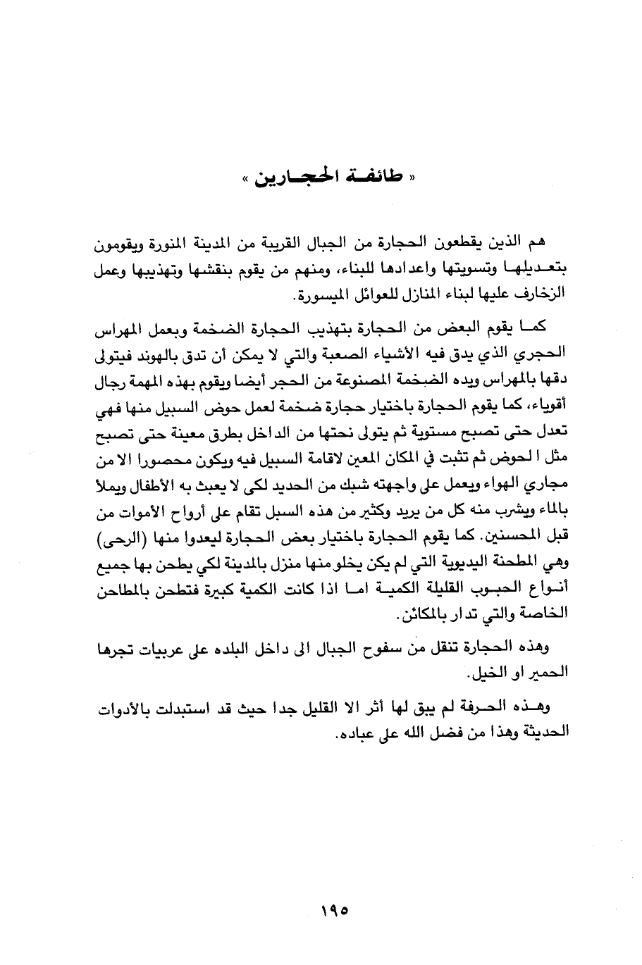 هم الذين يقطعون الحجارة من الجبال القريبة من المدينة المنورة ويقومون بتعديلها وتسويتها وإعدادها للبناء، ومنهم من يقوم بنقشها وتهذيبها وعمل الزخارف عليها لبناء المنازل للعوائل الميسورة. كما يقوم البعض من الحجارة بتهذيب الحجارة الضخمة وبعمل المهراس الحجري الذي يدق فيه الأشياء الصعبة والتي لا يمكن أن تدق بالهوند فيتولى دقها بالمهراس ويده الضخمة المصنوعة من الحجر ايضا ويقوم بهذه المهمة رجال أقوياء، كما يقوم الحجارة باختيار حجارة ضخمة لعمل حوض السبيل منها فهي تعدل حتى تصبح مستوية ثم يتولى نحتها من الداخل بطرق معينة حتى تصبح مثل الحوض ثم تثبت في المكان المعين لاقامة السبيل فيه ويكون محصورا الا من مجاري الهواء ويعمل على واجهته شبك من الحديد لكى لا يعبث به الاطفال ويملأ بالماء ويشرب منه كل من يريد وكثير من هذه السبل تقام على أرواح الأموات من قبل المحسنين. كما يقوم الحجارة باختيار بعض الحجارة ليعدوا منها (الرحى) وهي المطحنة اليديوية التي لم يكن يخلو منها منزل بالمدينة لكي يطحن بها جميع أنواع الحبوب القليلة الكمية اما اذا كانت الكمية كبيرة فتطحن بالمطاحن الخاصة والتي تدار بالمكائن. وهذه الحجارة تنقل من سفوح الجبال الى داخل البلده على عربيات تجرها الحمير او الخيل. وهذه الحرفة لم يبق لها أثر الا القليل جدا حيث قد استبدلت بالأدوات الحديثة وهذا من فضل الله على عباده.…