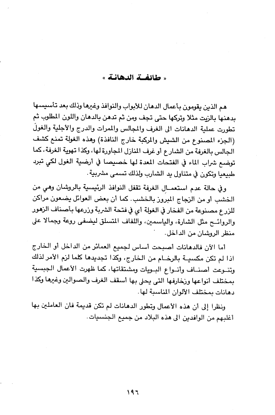 هم الذين يقومون بأعمال الدهان للأبواب والنوافذ وغيرها وذلك بعد تأسيسها بدهنها بالزيت مثلا وتركها حتى تجف ومن ثم تدهن بالدهان واللون المطلوب ثم تطورت عملية الدهانات الى الغرف والمجالس والممرات والدرج والأجلية والغول (الجزء المصنوع من الشيش والمركبة خارج النافذة) وهذه الغولة تمنع كشف الجالس بالغرفة من الشارع أو غرف المنازل المجاورة لها، وكذا تهوية الغرفة، كما توضع شراب الماء في الفتحات المعدة لها خصيصا في أرضية الغول لكي تبرد طبيعيا وتكون في متناول يد الشارب ولذلك تسمى مشربية. وفي حالة عدم استعمال الغرفة تقفل النوافذ الرئيسية بالروشان وهي من الخشب او من الزجاج المبروز بالخشب. كما أن بعض العوائل يضعون مراكن للزرع مصنوعة من الفخار في الغولة أي في فتحة الشربة وزرعها بأصناف الزهور والروائح مثل الشارة، والياسمين، واللفاف المتسلق ليضفى روعة وجمالا على منظر الروشان من الداخل. أما الآن فالدهانات أصبحت أساس لجميع العمائر من الداخل أو الخارج اذا لم تكن مكسية بالرخام من الخارج، وكذا تجديدها كلما لزم الأمر لذلك وتنوعت أصناف وأنواع البويات ومشتقاتها، كما ظهرت الأعمال الجبسية بمختلف انواعها وزخارفها التى يحلى بها أسقف الغرف والصوالين وغيرها وكذا دهانات بمختلف الألوان المناسبة لها. ونظر إلى أن هذه الأعمال وتطور الدهانات لم تكن قديمة فان العاملين بها أغلبهم من الوافدين الى هذه البلاد من جميع الجنسيات.…