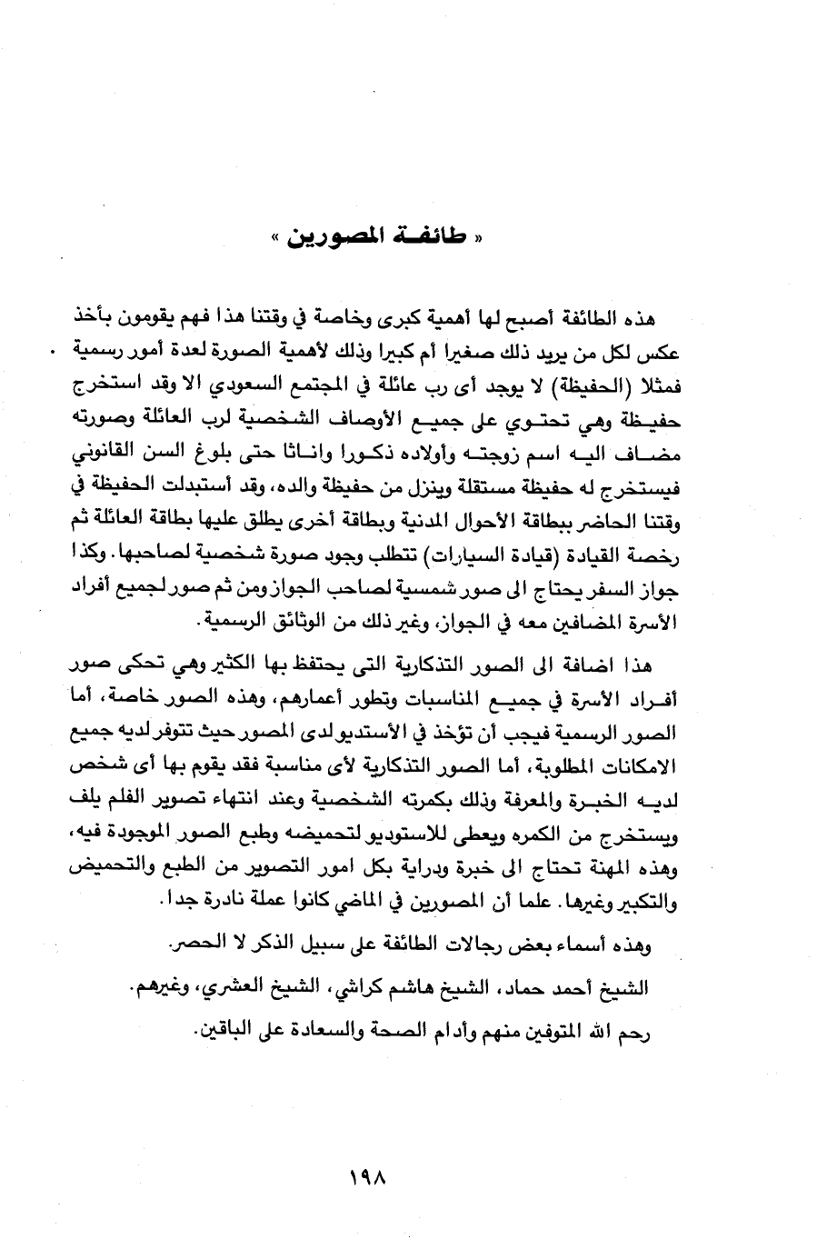 هذه الطائفة اصبح لها اهمية كبرى وخاصة في وقتنا هذا فهم يقومون باخذ عكس لكل من يريد ذلك صغيرا أم كبيرا وذلك لأهمية الصورة لعدة أمور رسمية فمثلا (الحفيظة) لا يوجد أى رب عائلة في المجتمع السعودي الا وقد استخرج حفيظة وهي تحتوي على جميع الأوصاف الشخصية لرب العائلة وصورته مضاف اليه اسم زوجته وأولاده ذكورا واناثا حتى بلوغ السن القانوني فيستخرج له حفيظة مستقلة وينزل من حفيظة والده، وقد استبدلت الحفيظة في وقتنا الحاضر ببطاقة الاحوال المدنية وبطاقة أخرى يطلق عليها بطاقة العائلة ثم رخصة القيادة (قيادة السيارات) تتطلب وجود صورة شخصية لصاحبها. وكذا جواز السفر يحتاج الى صور شمسية لصاحب الجواز ومن ثم صور لجميع أفراد الأسرة المضافين معه في الجواز، وغير ذلك من الوثائق الرسمية. هذا اضافة الى الصور التذكارية التى يحتفظ بها الكثير وهي تحكى صور أفراد الأسرة في جميع المناسبات وتطور أعمارهم، وهذه الصور خاصة، أما الصور الرسمية فيجب أن تؤخذ في الأستديو لدى المصور حيث تتوفر لديه جميع الامكانات المطلوبة، أما الصور التذكارية لأى مناسبة فقد يقوم بها أى شخص لديه الخبرة والمعرفة وذلك بكمرته الشخصية وعند انتهاء تصوير الفلم يلف ويستخرج من الكمره ويعطى للاستود يو لتحميضه وطبع الصور الموجودة فيه، وهذه المهنة تحتاج الى خبرة ودراية بكل امور التصوير من الطبع والتحميض والتكبير وغيرها. علما أن المصورين في الماضي كانوا عملة نادرة جدا. وهذه أسماء بعض رجالات الطائفة على سبيل الذكر لا الحصر. الشيخ احمد حماد، الشيخ هاشم كراشي، الشيخ العشري، وغيرهم. رحم الله المتوفين منهم وأدام الصحة والسعادة على الباقين.…