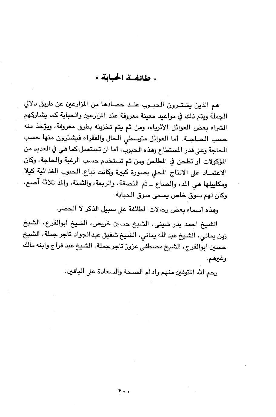 هم الذين يشترون الحبوب عند حصادها من المزارعين عن طريق دلالي الجملة ويتم ذلك في مواعيد معينة معروفة عند المزارعين والحبابة كما يشاركهم الشراء بعض العوائل الأثرياء، ومن ثم يتم تخزينه بطرق معروفة، ويؤخذ منه حسب الحاجة. أما العوائل متوسطي الحال والفقراء فيشترون منها حسب الحاجة وعلى قدر المستطاع وهذه الحبوب، أما ان تستعمل كما هي في العديد من المؤكولات او تطحن في المطاحن ومن ثم تستخدم حسب الرغبة والحاجة، وكان الاعتماد على الانتاج المحلي بصورة كبيرة وكانت تباع الحبوب الغذائية كيلا ومكاييلها هي المد، والصاع ـ ثم النصفة، والربعة، والثمنة، والمد ثلاثة آصع، وكان لهم سوق خاص يسمى سوق الحبابة. وهذه أسماء بعض رجالات الطائفة على سبيل الذكر لا الحصر. الشيخ احمد بدر شيني، الشيخ حسين خريص، الشيخ ابو الفرع، الشيخ زين يماني، الشيخ عبد الله يماني، الشيخ شفيق عبد الجواد تاجر جملة، الشيخ حسين ابو الفرج، الشيخ مصطفى عزوز تاجر جملة، الشيخ عيد فراج وابنه مالك وغيرهم. رحم الله المتوفين منهم وادام الصحة والسعادة على الباقين.…