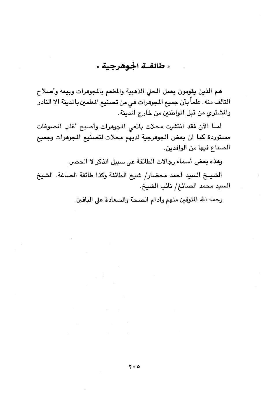 هم الذين يقومون بعمل الحلي الذهبية والمطعم بالمجوهرات وبيعه واصلاح التالف منه. علما بان جميع المجوهرات هي من تصنيع المعلمين بالمدينة الا النادر والمشتري من قبل المواطنين من خارج المدينة. اما الآن فقد انتشرت محلات بائعي المجوهرات واصبح اغلب المصوغات مستوردة كما ان بعض الجوهرجية لديهم محلات لتصنيع المجوهرات وجميع الصناع فيها من الوافدين. وهذه بعض اسماء رجالات الطائفة على سبيل الذكر لا الحصر. الشيخ السيد احمد محضار / شيخ الطائفة وكذا طائفة الصاغة. الشيخ السيد محمد الصائغ / نائب الشيخ. رحمه الله المتوفين منهم وادام الصحة والسعادة على الباقين.…