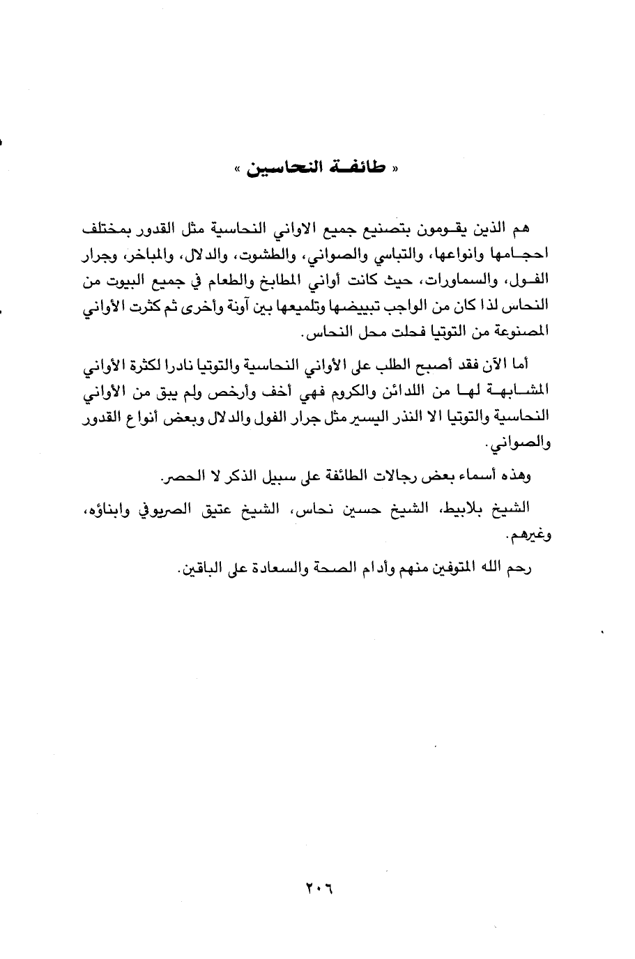 هم الذين يقومون بتصنيع جميع الاواني النحاسية مثل القدور بمختلف احجامها وانواعها، والتباسي والصواني، والطشوت، والدلال، والمباخر، وجرار الفول، والسماورات، حيث كانت اواني المطابخ والطعام في جميع البيوت من النحاس لذا كان من الواجب تبييضها وتلميعها بين آونة واخرى ثم كثرت الأواني المصنوعة من التوتيا فحلت محل النحاس. اما الآن فقد اصبح الطلب على الأواني النحاسية والتوتيا نادرا لكثرة الأواني المشابهة لها اللدائن والكروم فهي اخف وارخص ولم يبق من الأواني النحاسية والتوتيا الا النذر اليسير مثل جرار الفول والدلال وبعض انواع القدور والصواني. وهذه اسماء بعض رجالات الطائفة على سبيل الذكر لا الحصر. الشيخ بلابيط، الشيخ حسين نحاس، الشيخ عتيق الصريوفي وابناؤه، وغيرهم.