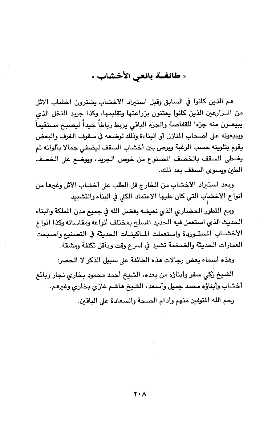 هم الذين كانوا في السابق وقبل استيراد الأخشاب يشترون اخشاب الاثل من المزارعين الذين كانوا يعتنون بزراعتها وتقليمها، وكذا جريد النخل الذي يبيعون منه جزءا للقفاصة والجزء الباقي يربط رباطا جيدا ليصبح مستقيما ويبيعونه على اصحاب المنازل او البناءة وذلك لوضعه في سقوف الغرف والبعض يقوم بتلوينه حسب الرغبة ويرص بين اخشاب السقف ليضفي جمالا بألوانه ثم يغطى السقف بالخصف المصنوع من خوص الجريد، ويوضع على الخصف الطين ويسوى السقف بعد ذلك. وبعد استيراد الأخشاب من الخارج قل الطلب على اخشاب الأثل وغيرها من انواع الأخشاب التي كان عليها الاعتماد الكلي في البناء والتشييد. ومع التطور الحضاري الذي نعيشه بفضل الله في جميع مدن المملكة والبناء الحديث الذي استعمل فيه الحديد المسلح بمختلف انواعه ومقاساته وكذا انواع الأخشاب المستوردة واستعملت الماكينات الحديثة في التصنيع واصبحت العمارات الحديثة والضخمة تشيد في اسرع وقت وباقل تكلفة ومشقة. وهذه اسماء بعض رجالات هذه الطائفة على سبيل الذكر لا الحصر: الشيخ زكي سفر وابناؤه من بعده، الشيخ احمد محمود بخاري نجار وبائع اخشاب وابناؤه محمد جميل واسعد، الشيخ هاشم غازي بخاري وغيرهم .. رحم الله المتوفين منهم وادام الصحة والسعادة على الباقين.…
