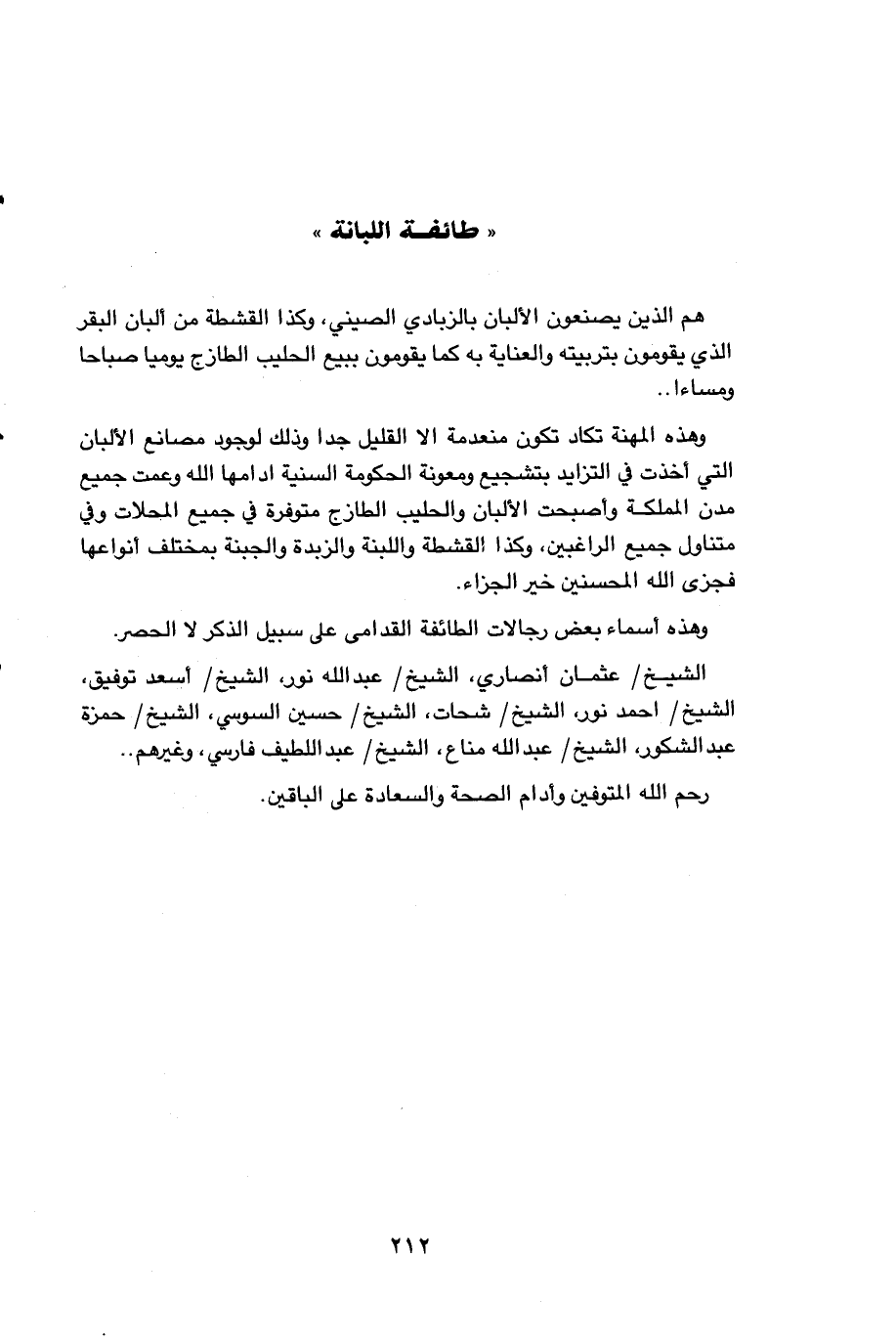 هم الذين يصنعون الألبان بالزبادي الصيني، وكذا القشطة من ألبان البقر الذي يقومون بتربيته والعناية به كما يقومون ببيع الحليب الطازج يوميا صباحا ومساءا. . وهذه المهنة تكاد تكون منعدمة الا القليل جدا وذلك لوجود مصانع الألبان التي أخذت في التزايد بتشجيع ومعونة الحكومة السنية ادامها الله وعمت جميع مدن المملكة وأصبحت الألبان والحليب الطازج متوفرة في جميع المحلات وفي متناول جميع الراغبين، وكذا القشطة واللبنة والزبدة والجبنة بمختلف أنواعها فجزى الله المحسنين خير الجزاء. وهذه أسماء بعض رجالات الطائفة القدامى على سبيل الذكر لا الحصر. الشيخ / عثمان أنصاري، الشيخ / عبد الله نور، الشيخ / أسعد توفيق، الشيخ / احمد نور، الشيخ / شحات، الشيخ / حسين السوسي، الشيخ / حمزة عبد الشكور، الشيخ / عبد الله مناع، الشيخ / عبد اللطيف فارسي، وغيرهم. . رحم الله المتوفين منهم وأدام الصحة والسعادة على الباقين.…