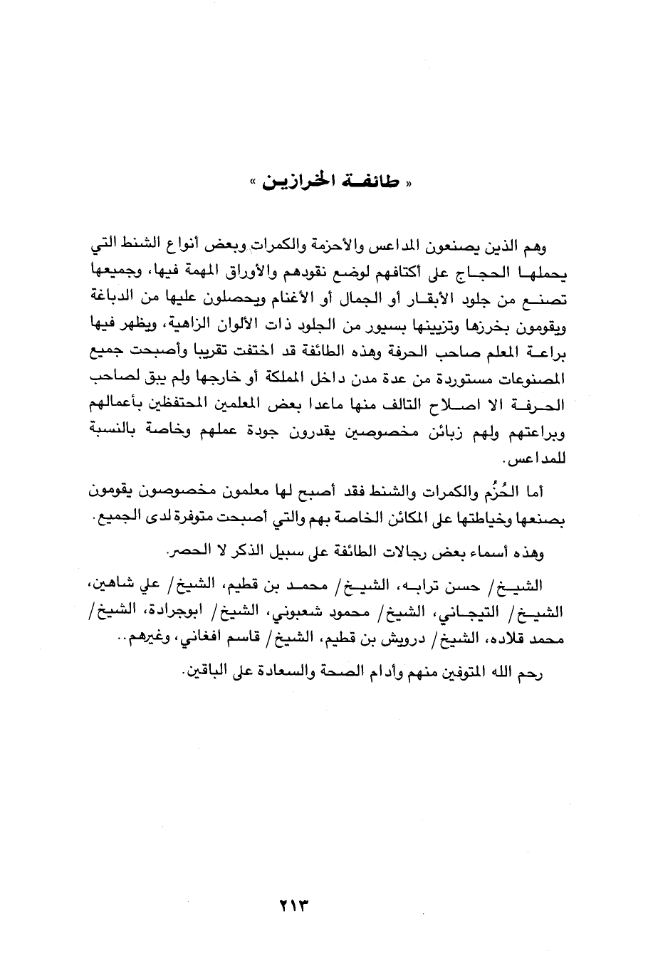 وهم الذين يصنعون المداعس والأحزمة والكمرات وبعض انواع الشنط التي يحملها الحجاج على اكتافهم لوضع نقودهم والاوراق المهمة فيها، وجميعها تصنع من جلود الابقار او الجمال او الاغنام ويحصلون عليها من الدباغة ويقومون بخرزها وتزيينها بسيور من الجلود ذات الألوان الزاهية، ويظهر فيها براعة المعلم صاحب الحرفة وهذه الطائفة قد اختفت تقريبا وأصبحت جميع المصنوعات مستوردة من عدة مدن داخل المملكة او خارجها ولم يبق لصاحب الحرفة الا اصلاح التالف منها ماعدا بعض المعلمين المحتفظين بأعمالهم وبراعتهم ولهم زبائن مخصوصين يقدرون جودة عملهم وخاصة بالنسبة للمداعس. أما الحزم والكمرات والشنط فقد أصبح لها معلمون مخصوصون يقومون بصنعها وخياطتها على المكائن الخاصة بهم والتي أصبحت متوفرة لدى الجميع. وهذه أسماء بعض رجالات الطائفة على سبيل الذكر لا الحصر. الشيخ / حسن ترابه، الشيخ / محمد بن قطيم، الشيخ / علي شاهين، الشيخ / التيجاني، الشيخ / محمود شعبوني، الشيخ / ابو جرادة، الشيخ / محمد قلاده، الشيخ درويش بن قطيم، الشيخ / قاسم افغاني، وغيرهم. . رحم الله المتوفين منهم وأدام الصحة والسعادة على الباقين.…