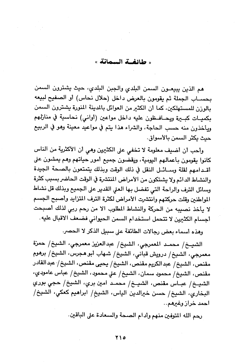 هم الذين يبيعون السمن البلدي والجبن البلدي، حيث يشترون السمن بحساب الجملة ثم يقومون بالعرض داخل (حلال نحاس) أو الصفيح لبيعه بالوزن للمستهلكين، كما أن الكثير من العوائل بالمدينة المنورة يشترون السمن بكميات كبيرة ويحافظون عليه داخل مواعين (أواني) نحاسية في منازلهم ويأخذون منه حسب الحاجة، والشراء هذا يتم في مواعيد معينة وهو في الربيع حيث يكثر السمن بالأسواق. وأحب أن اضيف معلومة لا تخفي على الكثيرين وهي ان الأكثرية من الناس كانوا يقومون بأعمالهم اليومية، ويقضون جميع أمور حياتهم وهم يمشون على أقدامهم لقلة وسائل النقل في ذلك الوقت وبذلك يتمتعون بالصحة الجيدة والنشاط الدائم ولا يشتكون من الأمراض المنتشرة في الوقت الحاضر بسبب كثرة وسائل الترف والراحة التي تفضل بها العلي القدير على الجميع وبذلك قل نشاط المواطنين وقلت حركتهم وانتشرت الأمراض لكثرة الترف المتزايد وأصبح الجسم لا يأخذ نصيبه من الحركة والنشاط المطلوب الا من رحم ربى لذلك أصبحت أجسام الكثيرين لا تتحمل استخدام السمن الحيواني فضعف الاقبال عليه. وهذه أسماء بعض رجالات الطائفة على سبيل الذكر لا الحصر. الشيخ / محمد المعمرجي، الشيخ / عبد العزيز معمرجي، الشيخ / حمزة معمرجي، الشيخ / درويش قباني، الشيخ / شهاب ابو هجرس، الشيخ / برهوم مقنص، الشيخ / عبد الكريم مقنص، الشيخ / يحيى مقنص، الشيخ / عبد القادر مقنص، الشيخ / محود سمان، الشيخ / علي محمود، الشيخ / عباس عامودي، الشيخ / عباس مقنص، الشيخ / محمد امين بري، الشيخ / حجي بوري البخاري، الشيخ / حسن خيرالدين الياس، الشيخ / ابراهيم كعكي، الشيخ / احمد خراز وغيرهم. . رحم الله المتوفين منهم وادام الصحة والسعادة على الباقين.…