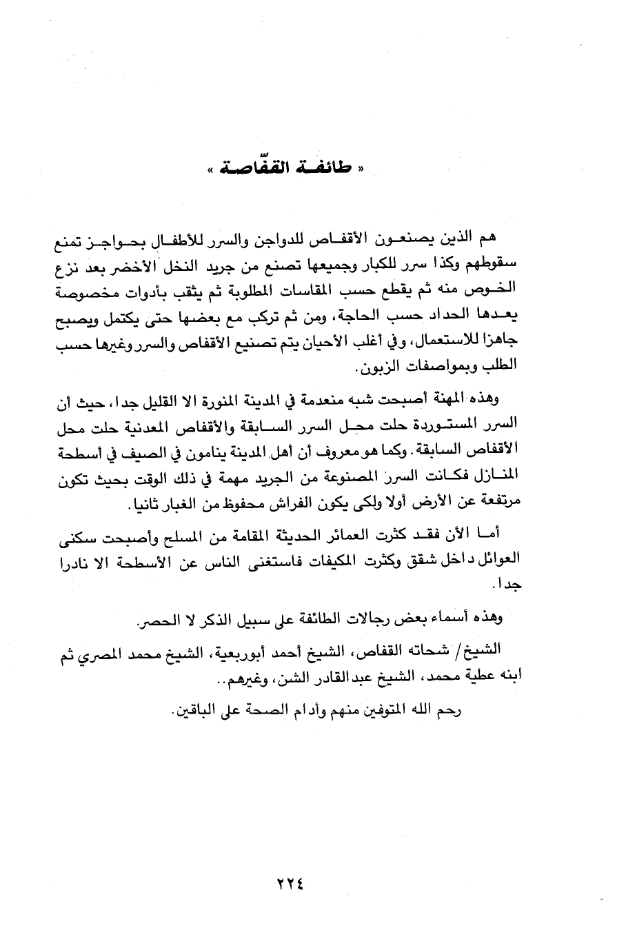 هم الذين يصنعون الأقفاص للدواجن والسرر للأطفال بحواجز تمنع سقوطهم وكذا سرر للكبار وجميعها تصنع من جريد النخل الأخضر بعد نزع الخوص منه ثم يقطع حسب المقاسات المطلوبة ثم يثقب بأدوات مخصوصة يعدها الحداد حسب الحاجة، ومن ثم تركب مع بعضها حتى يكتمل ويصبح جاهزا للاستعمال، وفي أغلب الأحيان يتم تصنيع الأقفاص والسرر وغيرها حسب الطلب وبمواصفات الزبون. وهذه المهنة أصبحت شبه منعدمة في المدينة المنورة الا القليل جدا، حيث أن السرر المستوردة حلت محل السرر السابقة والأقفاص المعدنية حلت محل الأقفاص السابقة. وكما هو معروف أن أهل المدينة ينامون في الصيف في أسطحة المنازل فكانت السرر المصنوعة من الجريد مهمة في ذلك الوقت بحيث تكون مرتفعة عن الأرض أولا ولكي يكون الفراش محفوظ من الغبار ثانيا. أما الأن فقد كثرت العمائر الحديثة المقامة من المسلح وأصبحت سكنى العوائل داخل شقق وكثرت المكيفات فاستغنى الناس عن الأسطحة الا نادرا جدا. وهذه أسماء بعض رجالات الطائفة على سيبل الذكر لا الحصر. الشيخ / شحاته القفاص، الشيخ احمد ابووبعية، الشيخ محمد المصري ثم ابنه عطية محمد، الشيخ عبد القادر الشن، وغيرهم. . رحم الله المتوفين منهم وأدام الصحة على الباقين.…