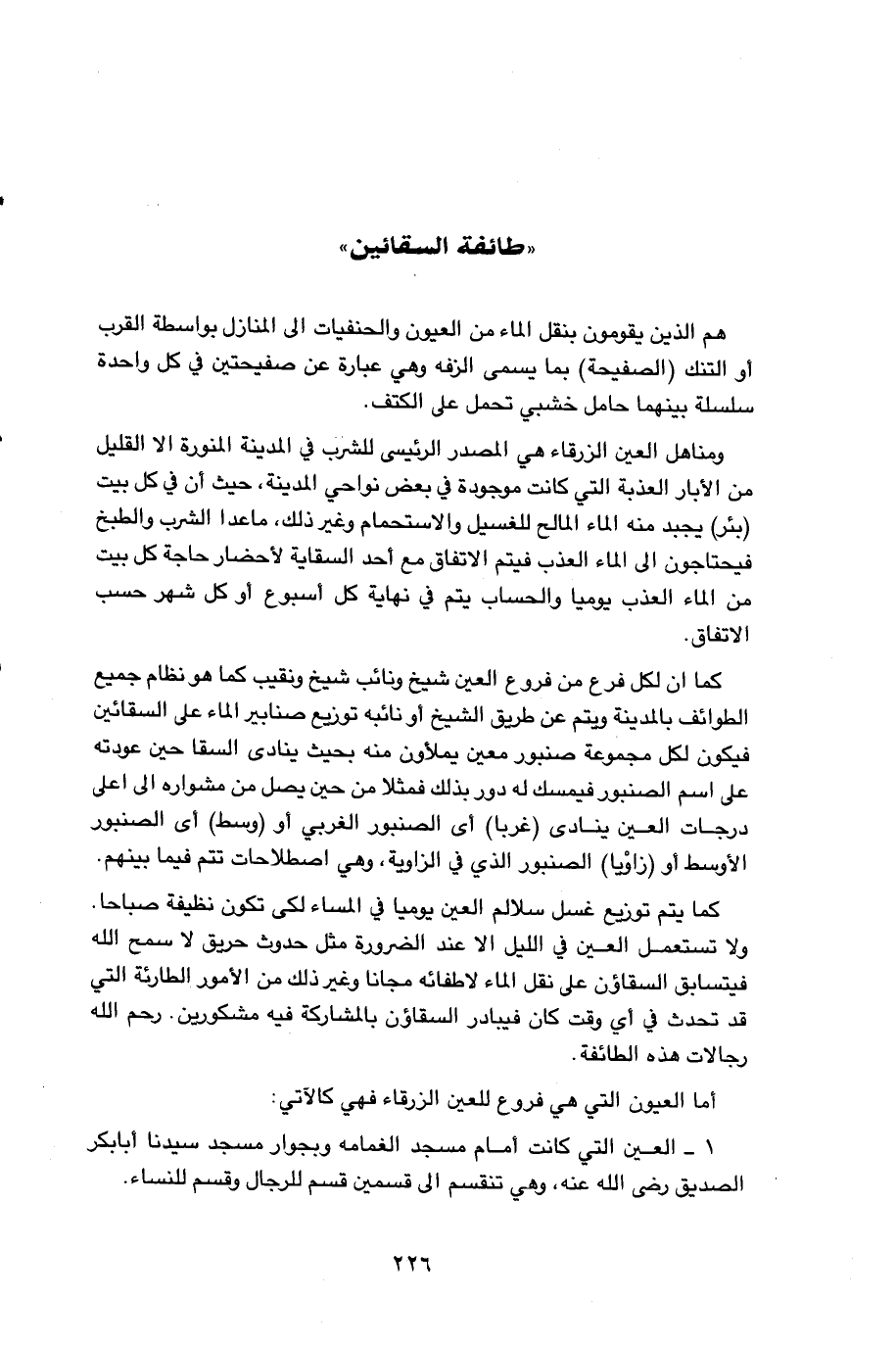 هم الذين يقومون بنقل الماء من العيون والحنفيات الى المنازل بواسطة القرب أو التنك (الصفيحة) بما يسمى الزفة وهي عبارة عن صفيحتين في كل واحدة سلسلة بينهما حامل خشبي تحمل على الكتف. ومناهل العين الزرقاء هي المصدر الرئيسى للشرب في المدينة المنورة الا القليل من الأبار العذبة التي كانت موجودة في بعض نواحي المدينة، حيث ان في كل بيت (بئر) يجبد منه الماء المالح للغسيل والاستحمام وغير ذلك، ماعدا الشرب والطبخ فيحتاجون الى الماء العذب فيتم الاتفاق مع احد السقاية لأحضار حاجة كل بيت من الماء العذب يوميا والحساب يتم في نهاية كل اسبوع او كل شهر حسب الاتفاق. كما ان لكل فرع من فروع العين شيخ ونائب شيخ ونقيب كما هو نظام جميع الطوائف بالمدينة ويتم عن طريق الشيخ أو نائبه توزيع صنابير الماء على السقائين فيكون لكل مجموعة صنبور معين يملأون منه بحيث ينادى السقا حين عودته على اسم الصنبور فيمسك له دور بذلك فمثلا من حين يصل من مشواره الى اعلى درجات العين ينادى (غربا) أى الصنبور الغربي أو (وسط) أى الصنبور الأوسط أو (زاويا) الصنبور الذي في الزاوية، وهي اصطلاحات تتم فيما بينهم. كما يتم توزيع غسل سلالم العين يوميا في المساء لكى تكون نظيفة صباحا. ولا تستعمل العين في الليل الا عند الضرورة مثل حدوث حريق لا سمح الله فيتسابق السقاؤن على نقل الماء لاطفائه مجانا وغير ذلك من الأمور الطارئة التي قد تحدث في أي وقت كان فيبادر السقاؤن بالمشاركة فيه مشكورين. رحم الله رجالات هذه الطائفة. أما العيون التي هي فروع للعين الزرقاء فهي كالآتي: