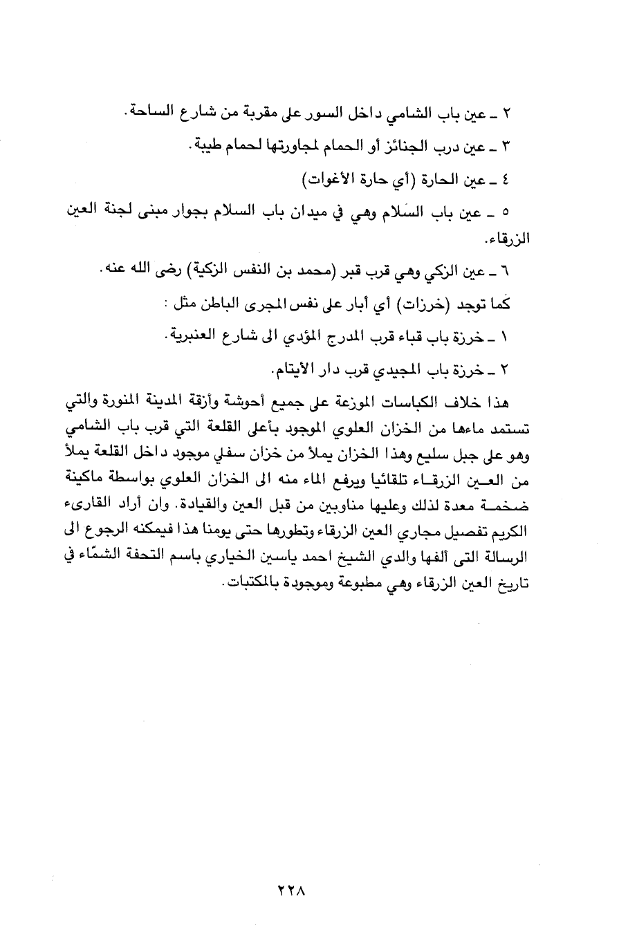 هذا خلاف الكباسات الموزعة على جميع أحوشة وأزقة المدينة المنورة والتي تستمد ماءها من الخزان العلوي الموجود بأعلى القلعة التي قرب باب الشامي وهو على جبل سليع وهذا الخزان يملأ من خزان سفلي موجود داخل القلعة يملأ من العين الزرقاء تلقائيا ويرفع الماء منه الى الخزان العلوي بواسطة ماكينة ضخمة معدة لذلك وعليها مناوبين من قبل العين والقيادة. وان أراد القارىء الكريم تفصيل مجاري العين الزرقاء وتطورها حتى يومنا هذا فيمكنه الرجوع الى الرسالة التي الفها والدي الشيخ احمد ياسين الخياري باسم التحفة الشماء في تاريخ العين الزرقاء وهي مطبوعة وموجودة بالمكتبات.…
