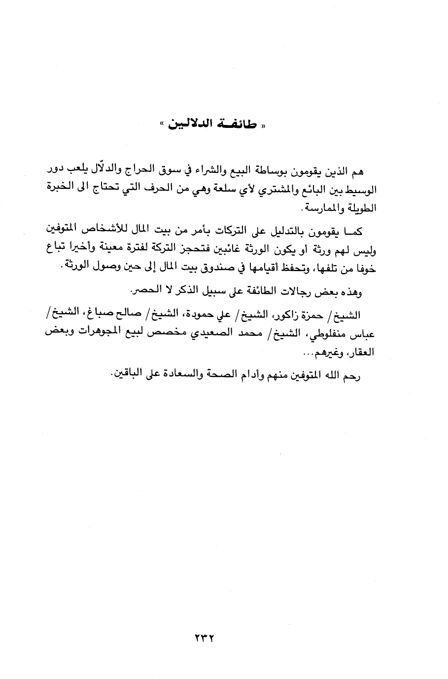 هم الذين يقومون بوساطة البيع والشراء في سوق الحراج والدلال يلعب دور الوسيط بين البائع والمشتري لأي سلعة وهي من الحرف التي تحتاج الى الخبرة الطويلة والممارسة. كما يقومون بالتدليل على التركات بأمر من بيت المال للأشخاص المتوفين وليس لهم ورثة او يكون الورثة غائبين فتحجز التركة لفترة معينة وأخيرا تباع خوفا من تلفها، وتحفظ اقيامها في صندوق بيت المال الى حين وصول الورثة. وهذه بعض رجالات الطائفة على سبيل الذكر لا الحصر. الشيخ / حمزة زاكور، الشيخ / علي حمودة، الشيخ / صالح صباغ، الشيخ / عباس منفلوطي، الشيخ / محمد الصعيدي مخصص لبيع المجوهرات وبعض العقار، وغيرهم. . .