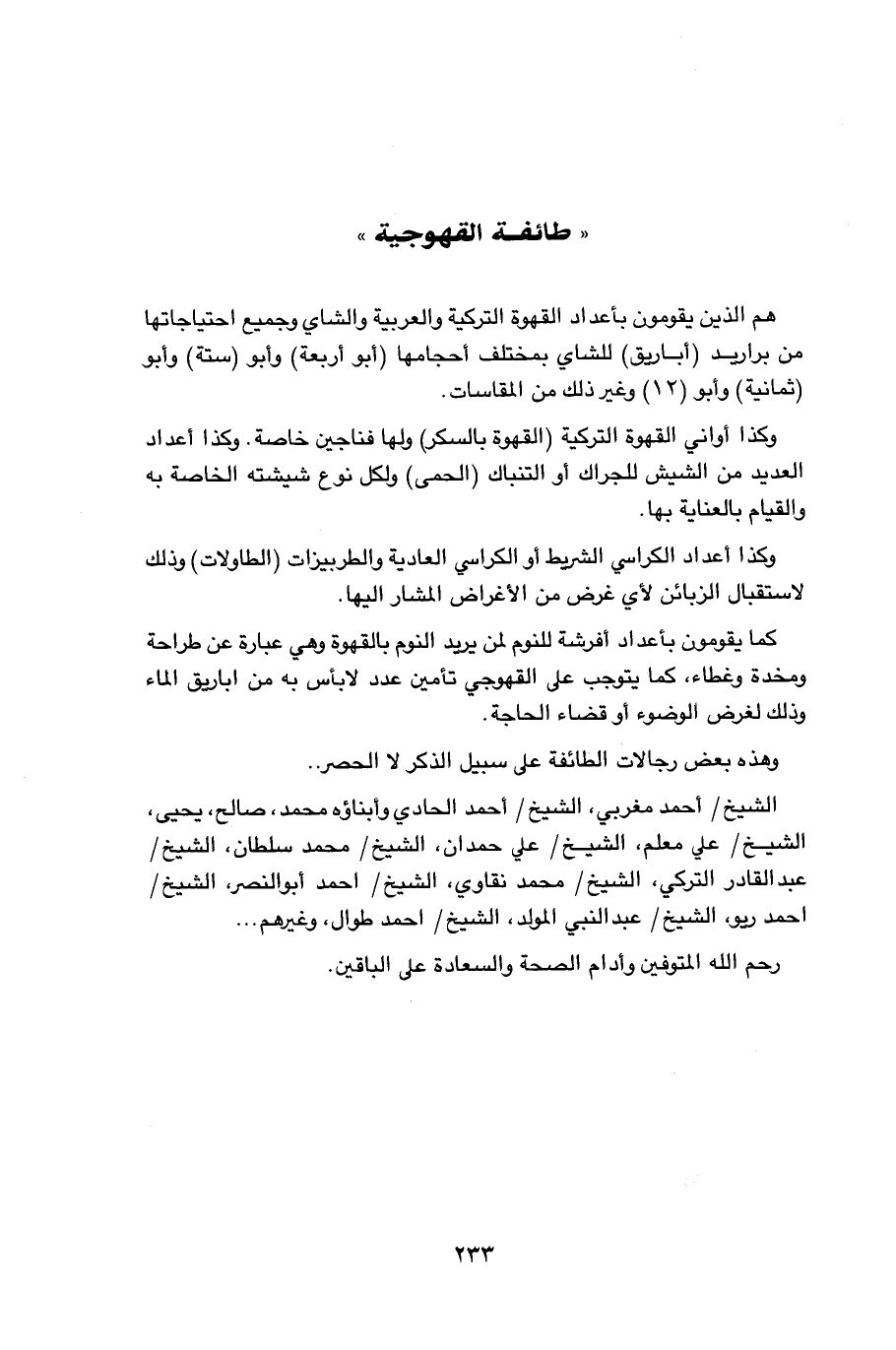 هم الذين يقومون باعداد القهوة التركية والعربية والشاي وجميع احتياجاتها من براريد (أباريق) للشاي بمختلف احجامها (أبو أربعة) وأبو (ستة) وأبو (ثمانية) وأبو (12) وغير ذلك من المقاسات. وكذا اواني القهوة التركية (القهوة بالسكر) ولها فناجين خاصة. وكذا أعداد العديد من الشيش للجراك أو التنباك (الحمى) ولكل نوع شيشته الخاصة به والقيام بالعناية بها. وكذا أعداد الكراسي الشريط أو الكراسي العادية والطربيزات (الطاولات) وذلك لاستقبال الزبائن لأي غرض من الأغراض المشار اليها. كما يقومون بأعداد أفرشة للنوم لمن يريد النوم بالقهوة وهي عبارة عن طراحة ومخدة وغطاء، كما يتوجب على القهوجي تأمين عدد لابأس به من اباريق الماء وذلك لغرض الوضوء أو قضاء الحاجة. وهذه بعض رجالات الطائفة على سبيل الذكر لا الحصر. الشيخ / احمد مغربي، الشيخ أحمد الحادي وأبناؤه محمد، صالح، يحيى، الشيخ / علي معلم، الشيخ / علي حمدان، الشيخ / محمد سلطان، الشيخ / عبد القادر التركي، الشيخ / محمد نقاوي، الشيخ / احمد ابو النصر، الشيخ / احمد ريو، الشيخ / عبد النبي المولد، الشيخ / احمد طوال، وغيرهم. . .