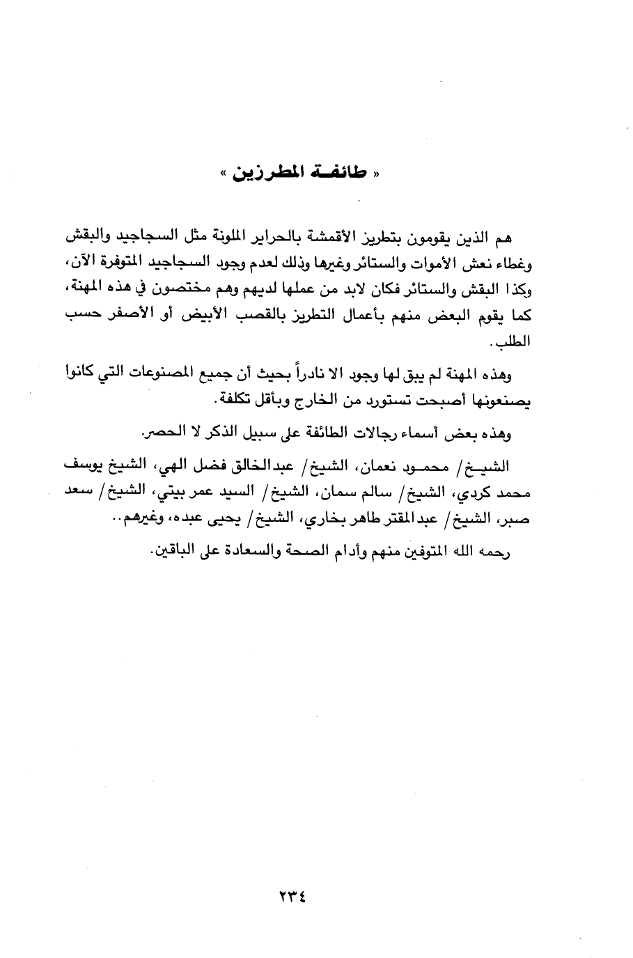 هم الذين يقومون بتطريز الأقمشة بالحراير الملونة مثل السجاجيد والبقش وغطاء نعش الأموات والستائر وغيرها وذلك لعدم وجود السجاجيد المتوفرة الآن، وكذا البقش والستائر فكان لابد من عملها لديهم وهم مختصون في هذه المهنة، كم يقوم البعض منهم بأعمال التطريز بالقصب الأبيض أو الأصفر حسب الطلب. وهذه المهنة لم يبق لها وجود الا نادراً بحيث أن جميع المصنوعات التي كانوا يصنعونها أصبحت تستورد من الخارج وباقل تكلفة. وهذه بعض اسماء رجالات الطائفة على سبيل الذكر لا الحصر. الشيخ / محمود نعمان، الشيخ / عبد الخالق فضل الهي، الشيخ / يوسف محمد كردي، الشيخ سالم سمان، الشيخ / السيد عمر بيتي، الشيخ /سعد صبر، الشيخ / عبد المقتر طاهر بخاري، الشيخ / يحيى عبده، وغيرهم. .