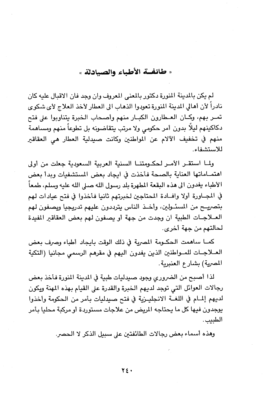 لم يكن بالمدينة المنورة دكتور بالمعنى المعروف وان وجد فان الاقبال عليه كان نادرا لان اهالي المدينة المنورة تعودوا الذهاب الى العطار لأخذ العلاج لأى شكوى تمر بهم، وكان العطارون الكبار منهم وأصحاب الخبرة يتناوبوا على فتح دكاكينهم ليلاً بدون أمر حكومي ولا مرتب يتقاضونه بل تطوعاً منهم ومساهمة منهم في تخفيف الآلام عن المواطنين وكانت صيدلية العطار هي العقاقير للاستشفاء. ولما استقر الأمر لحكومتنا السنية العربية السعودية جعلت من أولى اهتماماتها العناية بالصحة فأخذت في ايجاد بعض المستشفيات وبدأ بعض الأطباء يفدون الى هذه البقعة المطهرة بلد رسول الله صلى الله عليه وسلم، طمعاً في المجاورة أولا وافادة المحتاجين لخبرتهم ثانيا فأخذوا في فتح عيادات لهم بتصريح من المسئولين، وأخذ الناس يترددون عليهم تدريجيا ويصفون لهم العلاجات الطبية ان وجدت من جهة أو يصفون لهم بعض العقاقير المفيدة لحالتهم من جهة أخرى. كما ساهمت الحكومة المصرية في ذلك الوقت بايجاد أطباء وصرف بعض العلاجات للمواطنين الذين يفدون اليهم في مقرهم الرسمي مجانيا (التكية المصرية) بشارع العنبرية. لذا اصبح من الضروري وجود صيدليات طبية في المدينة المنورة فأخذ بعض رجالات العوائل التي توجد لديهم الخبرة والقدرة على القيام بهذه المهنة ويكون لديهم إلمام في اللغة الانجليزية في فتح صيدليات بأمر من الحكومة وأخذوا يوجدون فيها كل ما يحتاجه المريض من علاجات مستوردةأو مركبة محليا بأمر الطبيب. وهذه أسماء بعض رجالات الطائفتين على سبيل الذكر لا الحصر.…