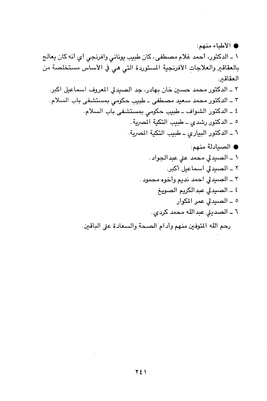 1 - الدكتور، أحمد غلام مصطفى، كان طبيب يوناني وافرنجي أي أنه كان يعالج بالعقاقير والعلاجات الافرنجية المستوردة التي هي في الاساس مستخلصة من العقاقير. 2 - الدكتور محمد حسين خان بهادر، جد الصيدلي المعروف اسماعيل ا كبر. 3 - الدكتور محمد سعيد مصطفى ـ طبيب حكومي بمستشفى باب السلام. 4 - الدكتور الشواف ـ طبيب حكومي بمستشفى باب السلام. 5 - الدكتور رشدي ـ طبيب التكية المصرية. 6 - الدكتور البياري ـ طبيب التكية المصرية.