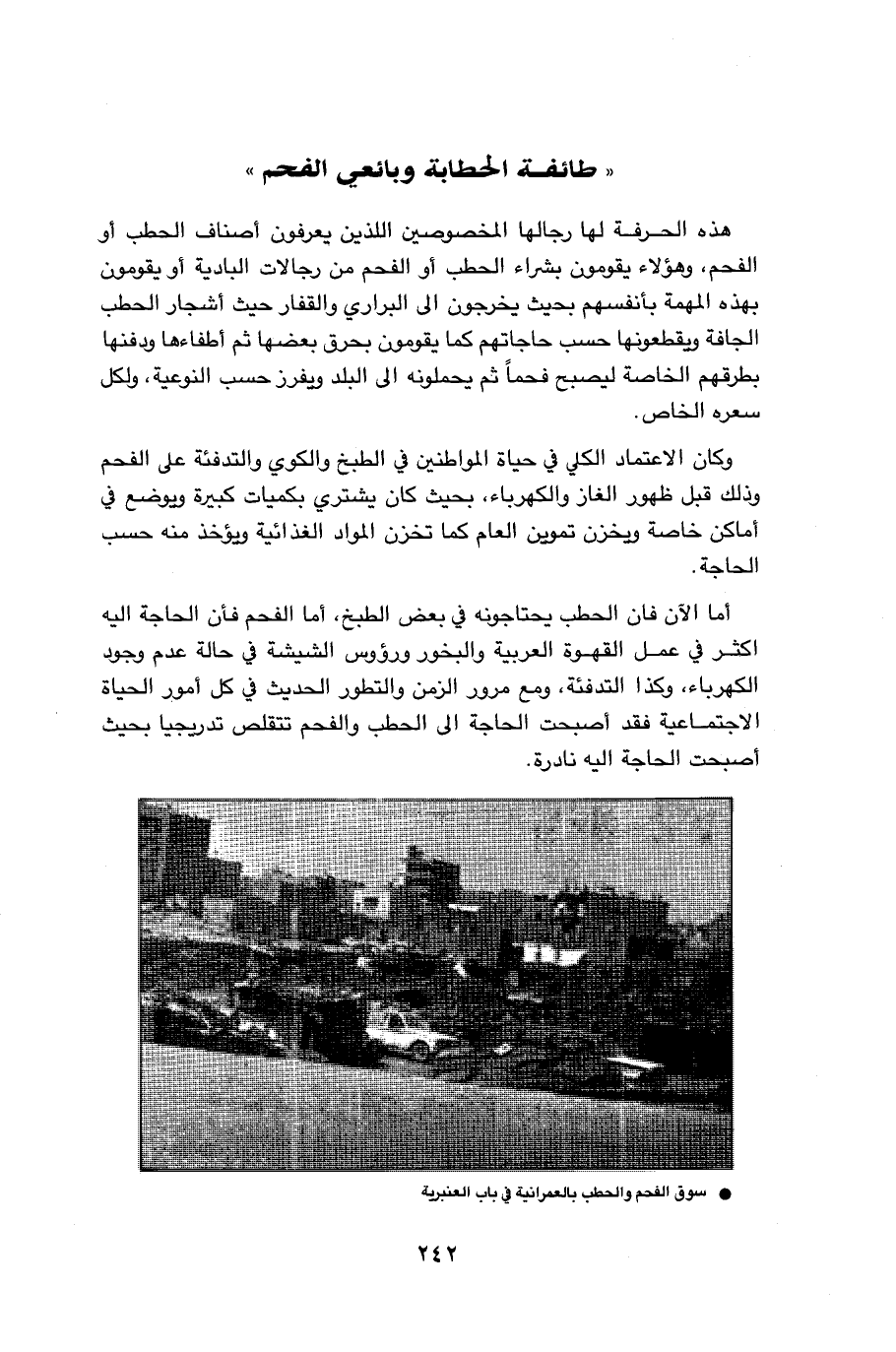 هذه الحرفة لها رجالها المخصوصين اللذين يعرفون أصناف الحطب أو الفحم ,وهؤلاء يقومون بشراء الحطب أو الفحم من رجالات البادية أو يقومون بهذه المهمة بأنفسهم بحيث يخرجون الى البراري والقفارحيث أشجار الحطب الجافة ويقطعونها حسب حاجاتهم كما يقومون بحرق بعضها ثم أطفاءها ودفنها بطرقهم الخاصة ليصبح فحما ثم يحملونه الى البلد ويفرزحسب النوعية ,ولكل سعره الخاص. وكان الاعتماد الكلي في حياة المواطنين في الطبخ والكوي والتدفئة على الفحم وذلك قبل ظهور الغاز والكهرباء , بحيث كان يشتري بكميات كبيرة ويوضع في أماكن خاصة ويخزن تموين العام كما تخزن المواد الغذائية ويؤخذ منه حسب الحاجة. أما الآن فان الحطب يحتاجونه في بعض الطبخ، أما الفحم فأن الحاجة اليه اكثر في عمل القهوة العربية والبخور ورؤوس الشيشة في حالة عدم وجود الكهرباء، وكذا التدفئة، ومع مرور الزمن والتطور الحديث في كل أمور الحياة الاجتماعية فقد أصبحت الحاجة الى الحطب والفحم تتقلص تدريجيا بحيث أصبحت الحاجة اليه نادرة. سوق الفحم والحطب بالعمرانية في باب العنبرية…