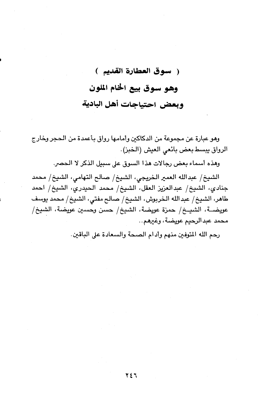 وهو عبارة عن مجموعة من الدكاكين وأمامها رواق بأعمدة من الحجر وخارج الرواق يبسط بعض بائعي العيش (الخبز). وهذه أسماء بعض رجالات هذا السوق على سبيل الذكر لا الحصر. الشيخ / عبد الله العمير الخريجي، الشيخ / صالح التهامي، الشيخ / محمد جنادي، الشيخ / عبد العزيز العقل، الشيخ / محمد الحيدري، الشيخ / احمد طاهر، الشيخ / عبد الله الخربوش، الشيخ / صالح مفتي، الشيخ / محمد يوسف عويضة، الشيخ / حمزة عويضة، الشيخ / حسن وحسين عويضة، الشيخ / محمد عبد الرحيم عويضة، وغيرهم. . رحم الله المتوفين منهم وأدام الصحة والسعادة على الباقين.…